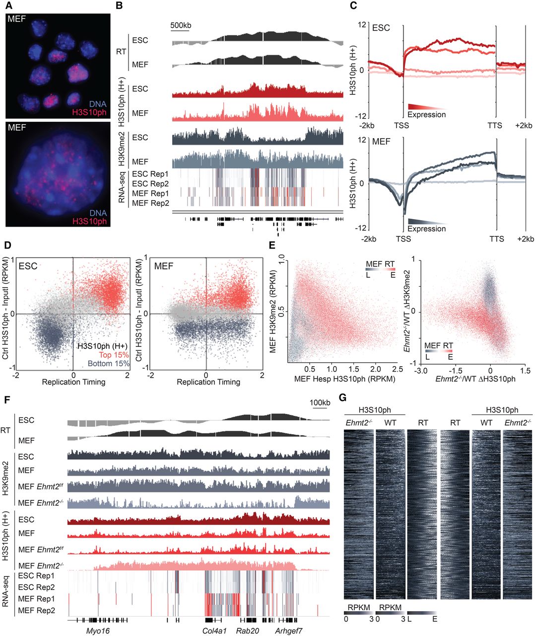 H3S10ph is restricted to genic regions in interphase MEFs. (A) H3S10ph immunostaining of interphase WT MEFs, counterstained with Hoechst 33342 for DNA, as in Figure 1A. (B) Genome browser screenshot showing RT, H3K9me2, and biological replicates of RNA-seq coverage in ESCs and MEFs as well as H3S10ph in Hesp-treated cells. (C) Metagene analysis of normalized H3S10ph enrichment (input subtracted RPKM) over all murine gene bodies (−2 kb-TSS-TTS+2 kb), clustered by RNA-seq expression levels into quartiles in the respective cell type. (D) Pair-wise comparison of H3S10ph with replication timing in asynchronous ESCs and MEFs using genome-wide 10-kb tiling bins. Red and blue data points correspond to bins that were in the top and bottom 15% of H3S10ph enrichment, respectively, in Hesp-treated cells. (E) Pair-wise comparison of H3S10ph (Hesp-treated) with H3K9me2 genome-wide (5-kb bins) in WT and Ehmt2−/− MEFs, overlaid with a heat map of MEF RT data with red and gray data points representing early- and late-replicating bins, respectively. (F) Genome browser snapshot of a MEF-specific early-replicon showing the loss of intergenic H3K9me2 and concurrent gain of H3S10ph in Ehmt2−/− MEFs. (G) Heat map of H3S10ph enrichment in Hesp-treated WT and Ehmt2−/− MEFs over 500 kb, centered on all RT transition boundaries in WT MEFs.