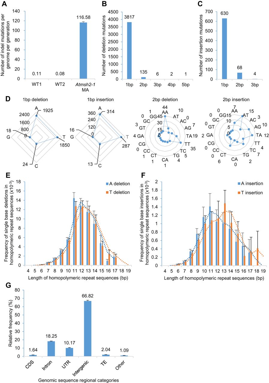 Characterization of indel mutations in MMR-deficient A. thaliana. (A) Frequency of indels (insertions and deletions) in G5 Atmsh2-1 MA line samples compared with that in wild-type (WT) controls (WT1 data from Ossowski et al. 2010; WT2 data from Jiang et al. 2014). Error bars indicate SEM (too small to be clearly visible in WT1 and WT2). (B,C) Length distributions (in bps) of indels in G5 Atmsh2-1 MA line samples: (B) deletions; (C) insertions. (D) Comparison of different classes of 1- and 2-bp indels accumulated in G5 Atmsh2-1 MA line samples. (E,F) Frequency of single-base A or T deletions (E) or A or T insertions (F) in different length categories of homopolymeric A or T repeat regions (values normalized by the number of each length category of homopolymeric A or T repeat region in the A. thaliana genome) (Supplemental Fig. 2A,B). Dotted lines indicate moving average trends. (G) Genomic distribution of indels in G5 Atmsh2-1 MA line samples. (CDS) coding sequence; (UTR) untranslated region; (TE) transposable element; (Other) noncoding RNAs and pseudogenes. Error bars in E–G indicate SEM (from eight different Atmsh2-1 MA biological replicates) (Supplemental Table 4).