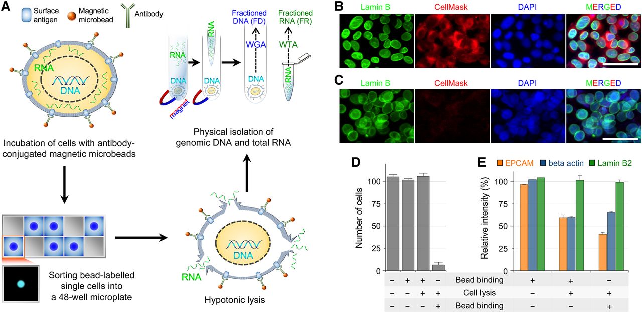 Principles of the SIDR method. (A) Schematic of the SIDR method. (WGA) whole-genome amplification; (WTA) whole transcriptome amplification. (B,C) Immunostaining of the nucleus after cell lysis. Fluorescence images of MCF7 cells in isotonic (B) and hypotonic (C) conditions. The nuclear lamina, plasma membrane, and nucleus were stained by the Alexa 488-labeled anti-Lamin B2 antibody (green), CellMask (red), and DAPI (blue), respectively. (D) The effect of cell lysis on the recovery rate of cells. The recovery rate dramatically depended on whether anti-EPCAM antibody-conjugated microbeads were bound to cells before or after cell lysis as indicated at the bottom of the graph. Approximately 100 MCF7 cells underwent bead binding and/or cell lysis and were magnetically recovered, except for control cells that were not bound to microbeads. The plot shows the number of cells recovered (n = 3). (E) The effect of bead binding on the solubilization of the EPCAM protein. The levels of EPCAM, beta actin, and Lamin B2 proteins in cell lysates not solubilized during cell lysis were measured by Western blot (n = 3).