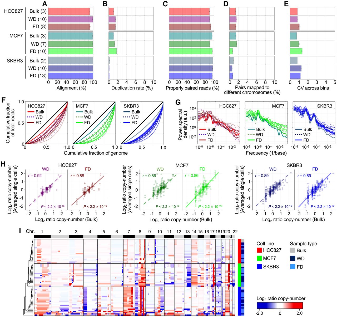 Evaluation of single-cell WGA performance using SIDR-seq. (A–D) Summary of sequencing metrics. The number of samples is indicated in parentheses. The plots display fractions of sequencing reads properly aligned to the human reference genome (A), duplicated (B), properly paired (C), and with their paired reads mapped to different chromosomes (D). (E) Bin-to-bin variability in genomic DNA read counts. (F) Lorenz curves illustrating the relationship between the cumulative fractions of the genome covered (x-axis) and those of mapped bases (y-axis). The diagonal black lines indicate theoretical perfect uniformity. (G) Power spectrum of read distributions over different genomic length scales. (H) Correlations of copy numbers between bulk cells and averaged single cells. Pearson's correlation coefficients (r) with their statistical significances (P) are shown. (I) Unsupervised clustering heatmap of genome-wide copy-number profiles in bulk and single cells from HCC827, MCF7, and SKBR3 cells. The dendrogram was generated based on the Euclidean distance metric with Ward's method (Ward 1963). (FD) DNA fractionated from single cells by SIDR; (WD) genomic DNA from the whole-cell lysates of single cells.