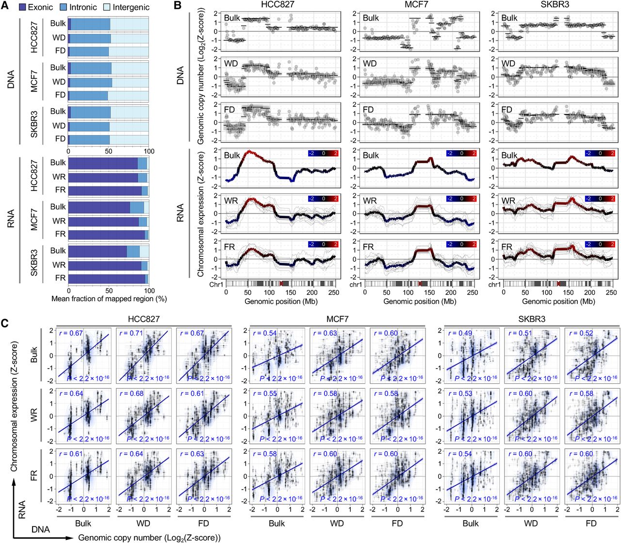 Integration of genome and transcriptome sequencing data generated by SIDR-seq. (A) Fractions of sequencing reads mapped to exonic, intronic, and intergenic regions of the human reference genome. Mean fractions of mapped regions were calculated from WGS and RNA-seq. (B) Chromosome-wide comparison between genomic copy numbers and gene expression in Chromosome 1. The upper three plots show log2 ratio of genomic copy numbers (dots) and their CBS-derived segmented values (black lines) estimated from bulk and single cells for DNA sequencing. The lower three plots show the chromosomal gene expression values from each single cell (thinner gray line) and their averages (colored line). Chromosomal gene expression correlated with copy-number events in WRs and FRs. Comparison plots for other chromosomes (from Chr 2 to Chr 22) are available in Supplemental Figure S15. (C) Correlation between DNA copy numbers and relative gene expression levels binned per 1 Mb genomic scale. Pearson's correlation coefficients (r) with their statistical significances (P) are shown. Genome sequencing from bulk, WDs, and FDs, and RNA sequencing data from bulk, WRs, and FRs were used for the comparison. (FD) DNA fractionated from single cells by SIDR; (WD) genomic DNA from the whole-cell lysates of single cells; (FR) RNA fractionated by SIDR from single cells; (WR) total RNA from whole-cell lysates of single cells.