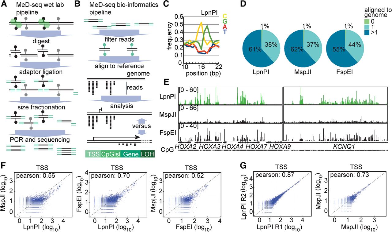 MeD-seq wet laboratory and bioinformatics platform. (A) Genomic DNA is digested with LpnPI, followed by DNA repair, adaptor ligation to 32-bp fragments, size fractionation, amplification, and sequencing. (B) Sequencing reads are trimmed, filtered based on the CpG sequence, and aligned to the genome. (C) Nucleotide frequency plotted against the position in the sequencing reads, showing enrichment of CG nucleotides around 16–17 bp from the start. (D) Alignment of LpnPI, MspJI, and FspEI CpG-filtered MeD-seq reads obtained using fibroblast DNA. (E) Sequencing read profiles of the HOXA and KCNQ1 loci obtained with fibroblast DNA using LpnPI, MspJI, and FspEI. (F) Pearson correlation analysis of MeD-seq read counts of TSSs for LpnPI-MspJI (left), LpnPI-FspEI (middle), and FspEI-MspJI (right) comparisons. (G) Pearson correlation analysis of read counts of TSSs for technical replicates digested with LpnPI (left) and MspJI (right).