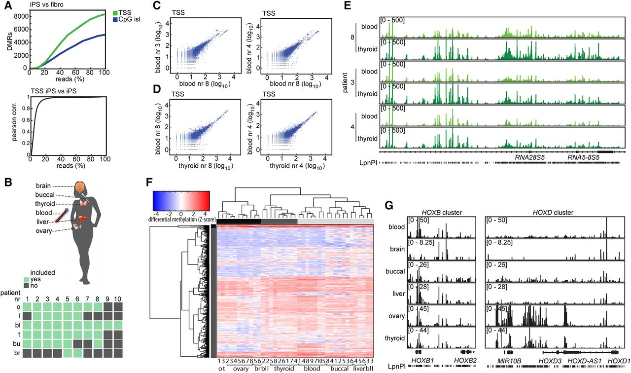 Tissue-specific DMRs. (A) DMR counts for TSSs and CpG islands and Pearson correlation analysis of TSSs upon in silico dilution starting with 150 million reads. (B) DNA was collected of available organs (green) from 10 different female patients. (C) Correlation analysis of TSS read counts between blood samples of different patients. (D) Correlation analysis of TSS read counts between different organs of the same patients. (E) MeD-seq tracks of ribosomal RNA cluster in DNA of blood and thyroid from patients 8, 3, and 4. (F) Unsupervised hierarchical clustering of tissues based on differentially methylated CpG islands. Statistical significance was called by χ2 testing and Bonferroni correction, the Z-scores of the read count are shown in the heatmap. (G) MeD-seq tracks of the HOXB and HOXD loci displaying differential methylation in TSS and CpG islands in different tissues.