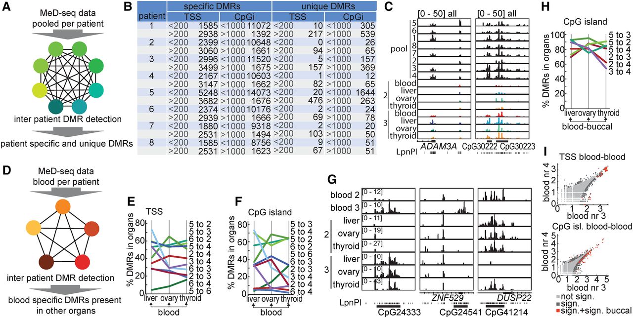 Patient-specific and unique DMRs. (A) MeD-seq data was pooled per patient to call interpatient-specific and unique TSS and CpG island DMRs that show differential methylation consistent in all tested tissues. (B) Overview showing the number of patient-specific and patient-unique TSS and CpG island DMRs identified. TSS and CpG island DMRs with a read count of more or less than 200 and 1000, respectively, are shown separately. (C) MeD-seq tracks showing patient-specific differential methylation of the ADAM3A TSS and patient-unique methylation of two CpG islands. (D) Patient-specific TSS DMRs were determined for blood that showed consistent DMRs in other organs tested. (E) Percentage of blood-specific TSS DMRs also present in liver, ovary, and thyroid in patient comparisons. (F) Percentage of blood-specific CpG island DMRs also present in liver, ovary, and thyroid in patient comparisons. (G) MeD-seq tracks showing blood-specific DMRs present in all organs (left), no other tested organ (ZNF529, middle), or some organs (DUSP22, right). (H) Percentage of CpG island DMRs present both in blood and buccal and also present in liver, ovary, and thyroid. (I) Correlation plots showing blood TSS DMRs also present in buccal (top) and blood CpG island DMRs also present in buccal (bottom) for patients 3 and 4.