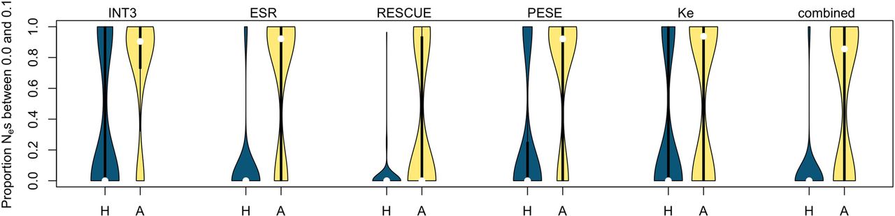 Negative control. Proportion of Nes below 0.1 over 100 control simulations, for the different motif sets and for human (H) and ancestral (A) CpG-filtering. Ancestral filtering consistently delivers a lower false-positive rate (less density at the bottom).