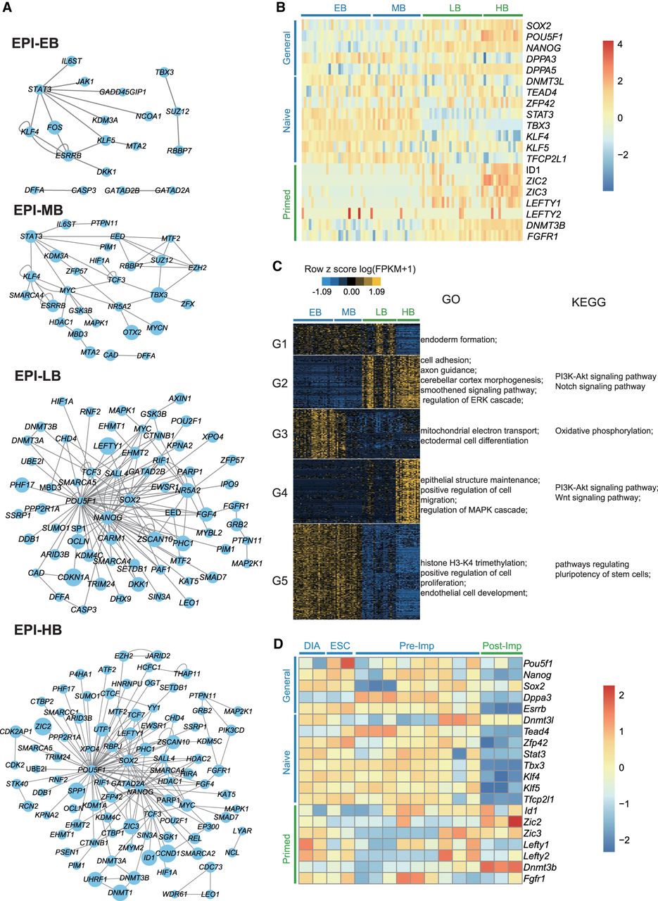 Distinct pluripotent states exist in rhesus monkey pre-implantation embryos. (A) PluriNetWork analysis of EPI cells from four blastocyst stages revealed a transition of network topology from mid- to late-blastocyst stage. (B) Expression pattern of marker genes for naive pluripotency, primed pluripotency, and general pluripotency in EPI cells of EB, MB, LB, and HB in rhesus monkey. (C) BICSKmeans clustering of differentially expressed genes (DEGs) (FDR < 0.01) in EPI cells from EB through to HB stages. The GO term and KEGG pathway enrichment of each group of DEGs are shown. In A–C, data were from 90 batch 2 EPI cells (EB, 29 cells; MB, 20 cells; LB, 24 cells; and HB, 17 cells). (D) Expression pattern of marker genes for naive pluripotency, primed pluripotency, and general pluripotency in EPI cells of pre-implantation and post-implantation embryos in mouse. Analysis was performed on the archival data from Boroviak et al. (2015).