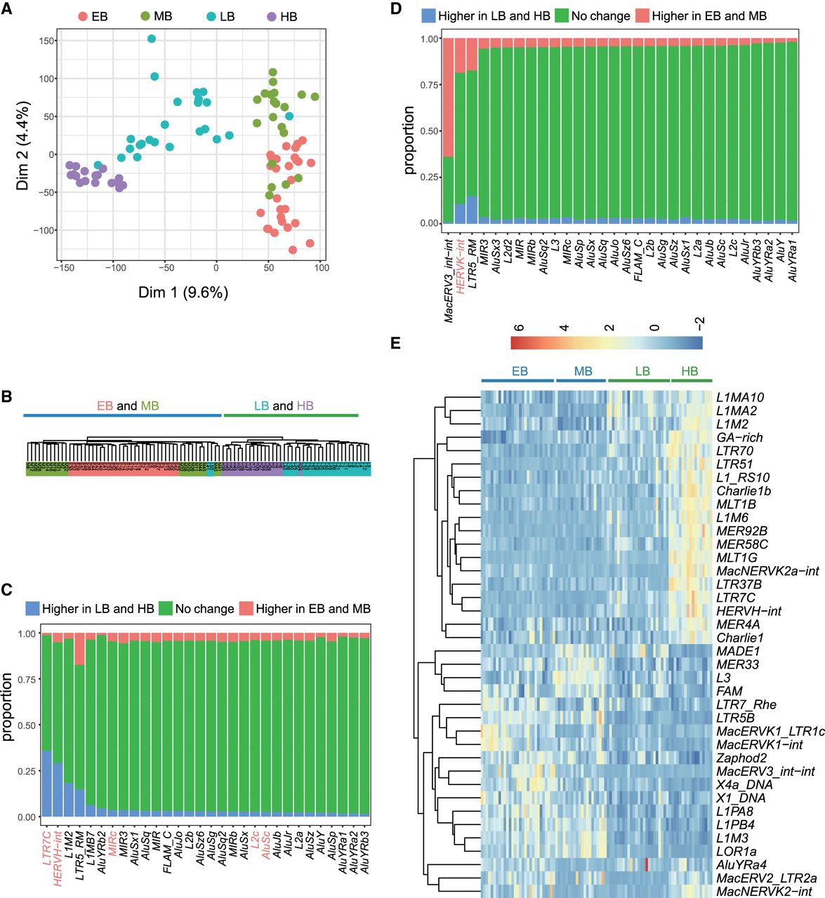 Transposable elements define the distinct cellular states of EPI cells from EB through to HB. PCA (A) and hierarchical clustering (B) analyses using the expression profiles of transposable elements segregated the EPI cells of EB and MB from those of LB and HB. (C) Transposable element subfamilies that showed biased expression in LB and HB stages. (D) Transposable element subfamilies that showed biased expression in EB and MB stages. In C and D, columns are split into segments, representing loci with higher expression in LB and HB (P-values < 0.05) (Higher in LB and HB), loci with higher expression in EB and MB (Higher in EB and MB), and loci with no expression difference in all stages (No change). (E) Differentially expressed transposable element subfamilies (FDR < 0.05) also identified the naive-primed transition at blastocyst stages. All data were obtained from 90 batch 2 EPI cells (EB, 29 cells; MB, 20 cells; LB, 24 cells; and HB, 17 cells).