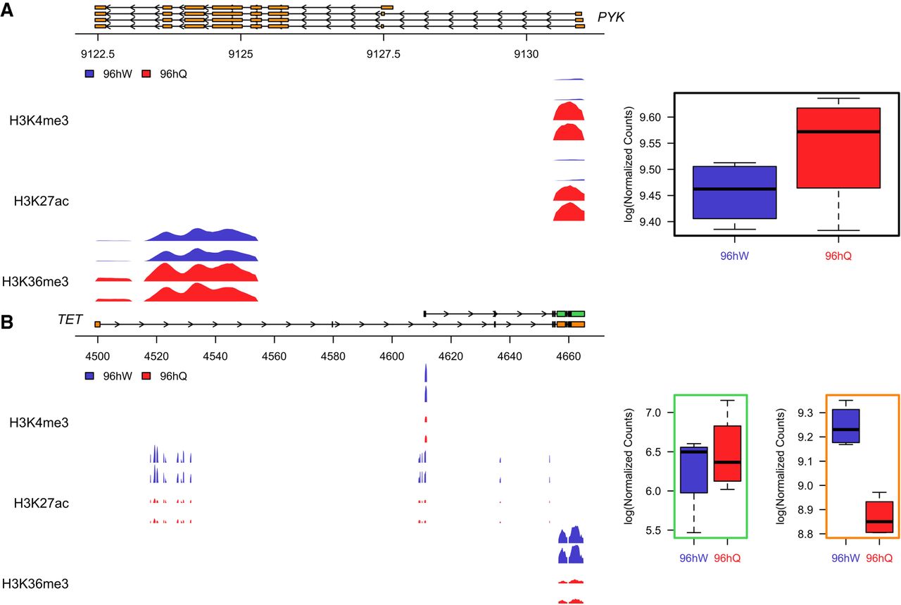 Profiles of two genes that show a significant difference in both ChIP-seq enrichment and transcript expression between castes. (A) Pyruvate kinase (PYK; LOC552007). Regions are shown which reach genome-wide significance (P ≤ 0.01) and have a greater than threefold difference in enrichment over input between 96hW (blue) and 96hQ (red). The expression profile is shown in the right panel. (B) Ten-eleven translocation (TET; LOC412878). Regions are shown which reach genome-wide significance (P ≤ 0.01) and have a greater than threefold difference in enrichment over input between 96hW (blue) and 96hQ (red) for both TET transcripts, XM_016915488 (upper transcript) and XM_006561197 (lower transcript). The expression profile is also shown for transcripts XM_016915488 (left) and XM_006561197 (right).