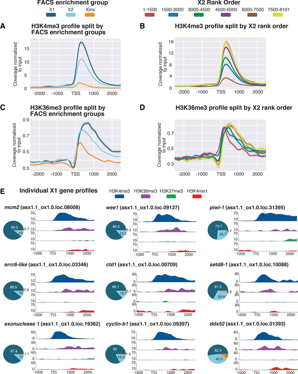 Histone marks for actively transcribed genes in X1 NBs. (A) Average H3K4me3 ChIP-seq coverage profiles across X1-, X2-, and Xins-enriched loci in X1 NBs across biological replicates following outlier removal. The y-axis represents the difference in coverage between sample and input, and the x-axis represents 2.5 kb upstream of and downstream from the TSS. H3K4me3 signal is highest around the promoter-proximal region close to the TSS for X1-enriched loci in NBs consistent with the role of H3K4me3 in active transcription. (B) H3K4me3 ChIP-seq profiles following outlier removal for X2 genes ranked from high to low X2 proportional expression. H3K4me3 signal in NBs decreases with an increase in proportion of X2 expression, indicative of high-ranking X2 genes having a predominant role in post-mitotic progeny as opposed to NBs. (C) Average H3K36me3 ChIP-seq profile across X1-, X2-, and Xins-enriched loci in X1 NBs across biological replicates following outlier removal. The y-axis represents the difference in coverage between sample and input, and the x-axis represents 2.5 kb upstream of and downstream from the TSS. Signal for H3K36me3 is promoter-proximal for Xins genes, whereas the magnitude of signal is greater and shifted 3′ for X1 genes. (D) H3K36me3 ChIP-seq profiles following outlier removal for X2 genes from high to low X2 proportional ranking. H3K36me3 signal in NBs shifts to the 3′ end with a decrease in X2 proportion, consistent with these lowly ranked genes having transcriptional activity in NBs. (E) H3K4me3 and H3K36me3 (active marks) and H3K4me1 and H3K27me3 (suppressive marks) ChIP-seq profiles for highly expressed X1 genes in NBs. The y-axis represents percentage coverage for each mark and allows for the four epigenetic marks to be directly compared. The x-axis represents 1.0 kb upstream of and 2.5 kb downstream from the TSS. Pie charts represent proportional expression for each gene in X1 (dark blue), X2 (light blue), and Xins (orange).