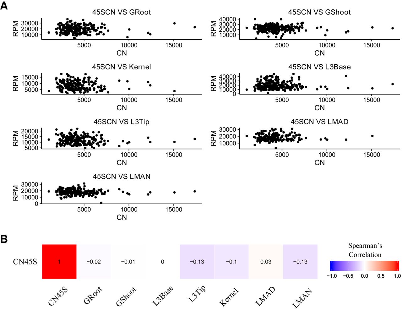 The relationship between 45S rDNA CN and 45S rRNA expression. (A) Correlation of 45S CN and expression in seven tissues. (B) Spearman's correlation coefficients between 45S rRNA CN and expression data in seven different tissues.