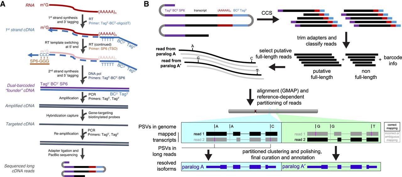 Transcript capture and long-read sequencing for resolution of nearly identical duplicate genes. (A) Poly(A)+ RNA is converted to first-strand cDNA by reverse transcriptase (RT) using a specialized oligo(dT) primer containing the 3′ barcode (BC) and an outer sequence tag for later amplification. Template-independent cDNA synthesis extends the 3′ end of the cDNA with oligo-dC. RT extends the cDNA by pairing to a template switch oligo (TSO; SP6 sequence) with 3′ rG bases. Second-strand synthesis is carried out with DNA polymerase and a primer directed toward the SP6 sequence, containing the 5′ barcode and the other outer tag. After ssDNA depletion, the recovered ds-cDNA founder molecules are amplified before biotinylated probes designed to genes of interest are used for hybridization capture. A final PCR step on the target-enriched cDNA generates double-stranded molecules for long-read sequencing. (B) As part of a modified Iso-Seq workflow, sequences are first error-corrected through circular consensus sequence (CCS) generation. Then for each read, the sequences flanking the transcripts are identified and trimmed. If such sequences are present on both ends, reads are designated as putative full-length (pFL). pFL reads are mapped to the human reference (GRCh38), where the presence of multiple PSVs along the long read promotes accurate mapping even in the presence of sequencing errors. To avoid confounding paralogs, confidently mapped reads (MAPQ > 40) are partitioned into genomic segments before the Iso-Seq cluster step is performed.