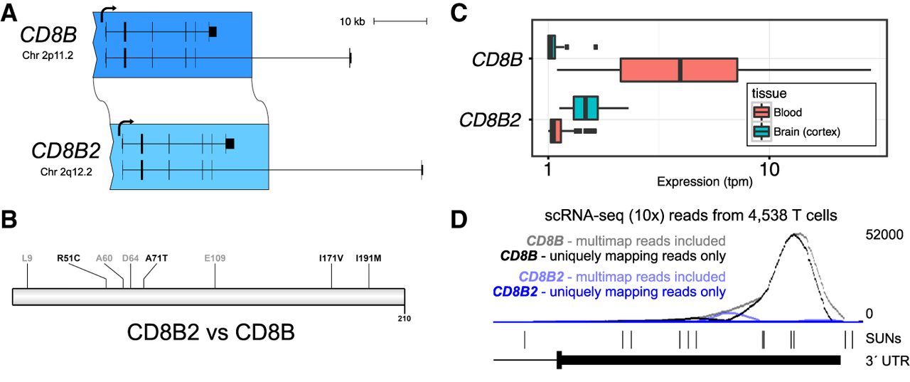 Tissue-specific loss and gain of expression in CD8B2 and maintenance of ancestral open-reading frame (ORF). (A) CD8B was duplicated in full (canonical isoform) from the p-arm to the q-arm of Chromosome 2, generating CD8B2. (B) We identify expressed transcripts from CD8BP that resemble those of CD8B and maintain the 210 aa ORF but with four amino acid replacements. (C) Tissue-specific expression estimates generated using Kallisto and GTEx RNA-seq data indicate that, relative to CD8B, CD8B2 has almost entirely lost expression in blood and gained expression in brain (cortex). Transcripts per million (tpm) plotted with log scale. (D) Single-cell RNA-seq data from T cells (10x Genomics) supports that CD8B2 expression has been lost specifically in T cells likely due to the duplication excluding a tissue-specific enhancer (see text). While multimap RNA-seq reads map to both paralogs because they lack singly unique nucleotides (SUNs) that distinguish the two, uniquely mapping reads from T cells map exclusively to ancestral CD8B.