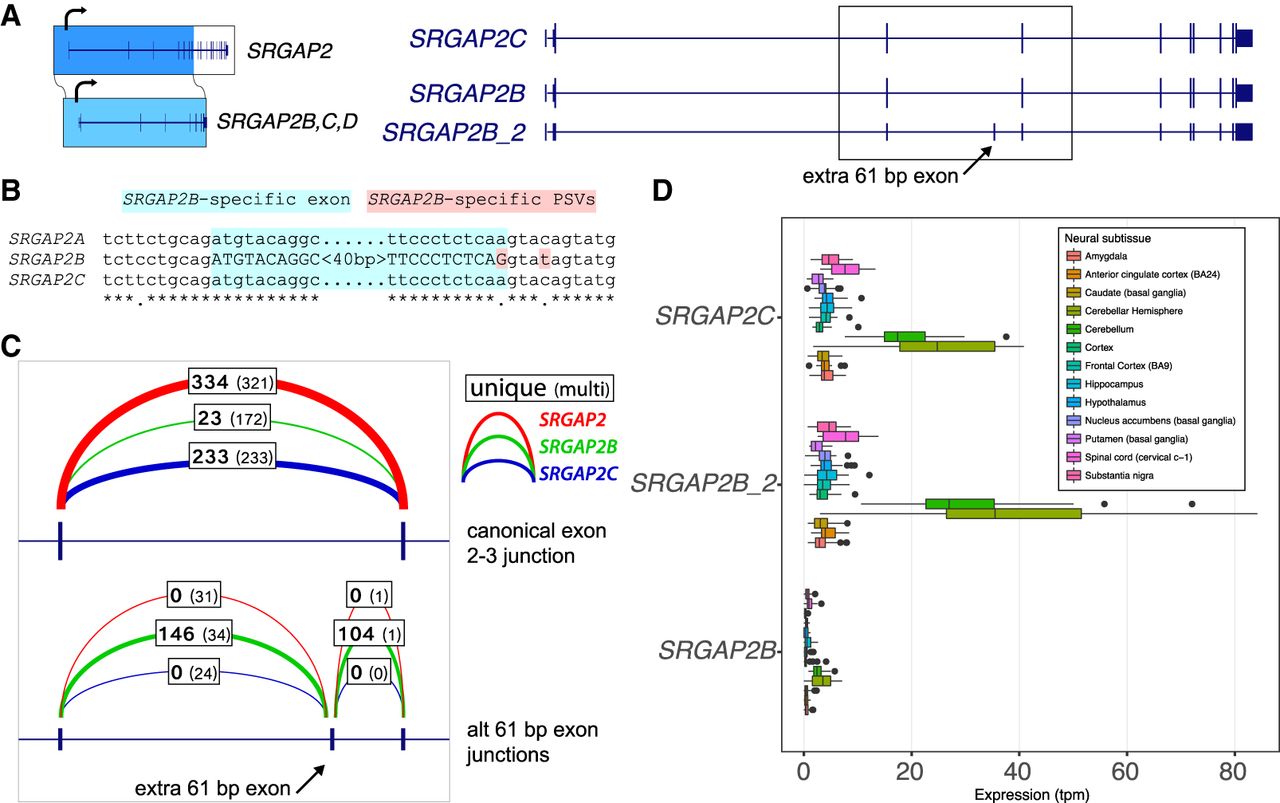 Inclusion of a 61-bp exon and premature stop codon in SRGAP2B. (A) SRGAP2B and SRGAP2C are duplicate copies of SRGAP2, created by an initial 3′-truncated duplication ∼3 Myr ago. From the long-read capture data, we identify a major isoform (here SRGAP2B_2) containing an additional 61-bp exon (arrow). (B) Alignment of the 61-bp exon (highlighted in light blue) and flanking sequence identifies a key nucleotide change in the −1 position of the splice donor (highlighted in red). This A-to-G transition is predicted to substantially increase the strength of the splice donor signal. (C) Intron-spanning reads from GTEx RNA-seq data from brain (cortex) were counted for each paralog if they were consistent with the canonical exon 2–3 junction (above), or consistent with the extra 61-bp exon (below), with counts for SRGAP2 (red), SRGAP2B (green), and SRGAP2C (blue) shown. Boldface denotes uniquely mapping reads. The additional exon is frequently included in SRGAP2B transcripts, while rarely included if at all in SRGAP2A and SRGAP2C. (D) Expression estimates for isoforms shown in A generated using Kallisto and GTEx RNA-seq data corroborate that the isoform of SRGAP2B that includes the 61-bp exon is the predominant one in neural tissues. These subsequent mutational changes likely nonfunctionalized SRGAP2B and are consistent with the fixation of the granddaughter duplicate SRGAP2C in the human population.