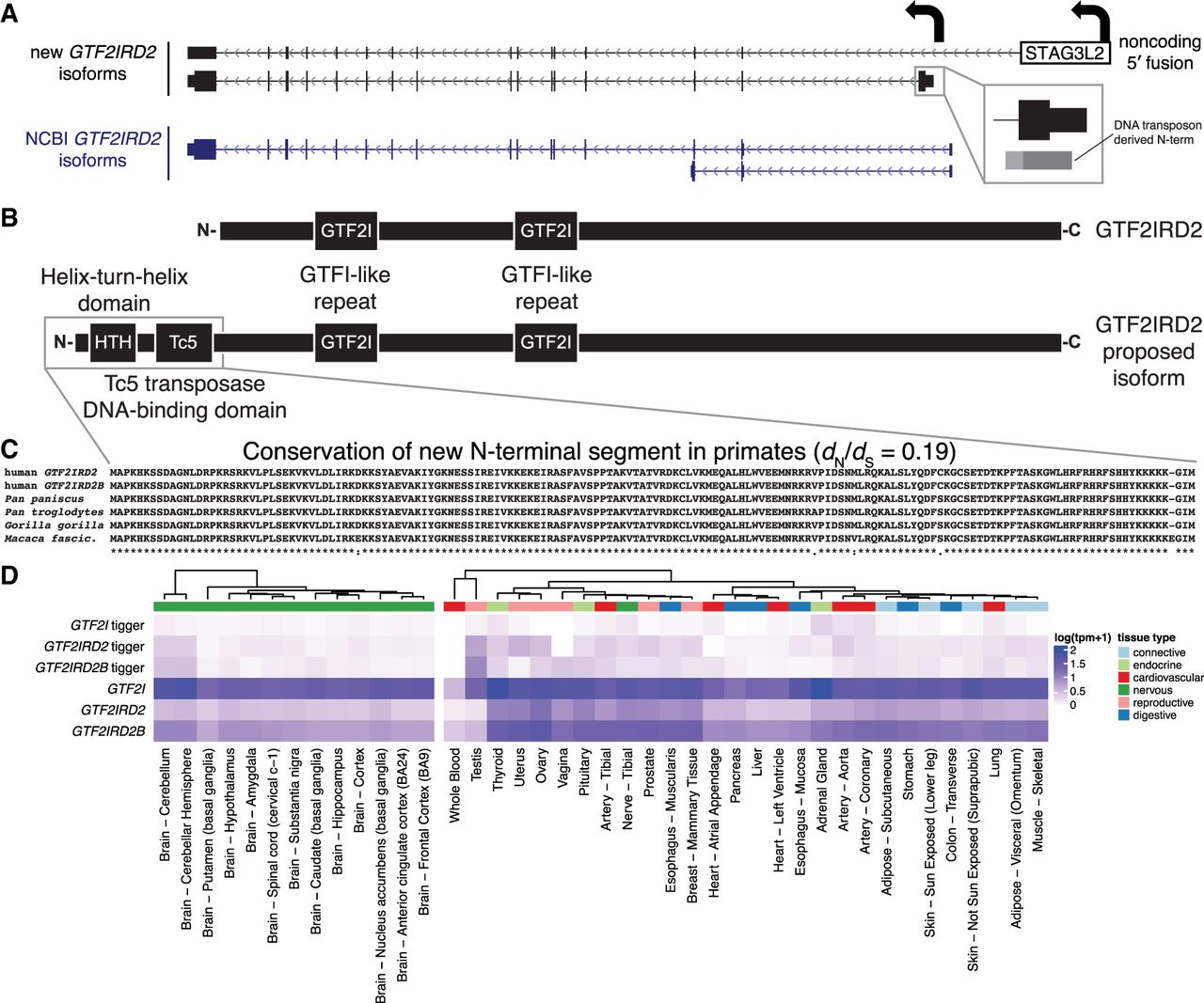 Discovery of novel N-terminal segment DNA-binding domains for GTF2IRD2 and GTF2I. (A) Two classes of novel isoforms were identified for the human-specific duplicate gene GTF2IRD2 (transcribed from right to left in this view), shown above the current NCBI gene annotations. The upper isoform consists of an out-of-frame gene fusion to upstream gene STAG3L2 while the lower isoform includes an alternative first exon, derived from a DNA transposon (TcMar-Tigger family), yielding a new N-terminal segment. (B) The proposed GTF2IRD2 isoform contains two additional N-terminal DNA-binding domains (helix-turn-helix domain and a Tc5 transposase DNA-binding domain) derived from the DNA transposon Tigger7. (C) A multiple sequence alignment of the newly identified N-terminus predicted protein sequences shows conservation among primates. (D) A heatmap of expression levels estimated using Kallisto across tissues (GTEx) shows that the canonical form is more broadly expressed than the transposon-containing isoform with the exception of the testis.