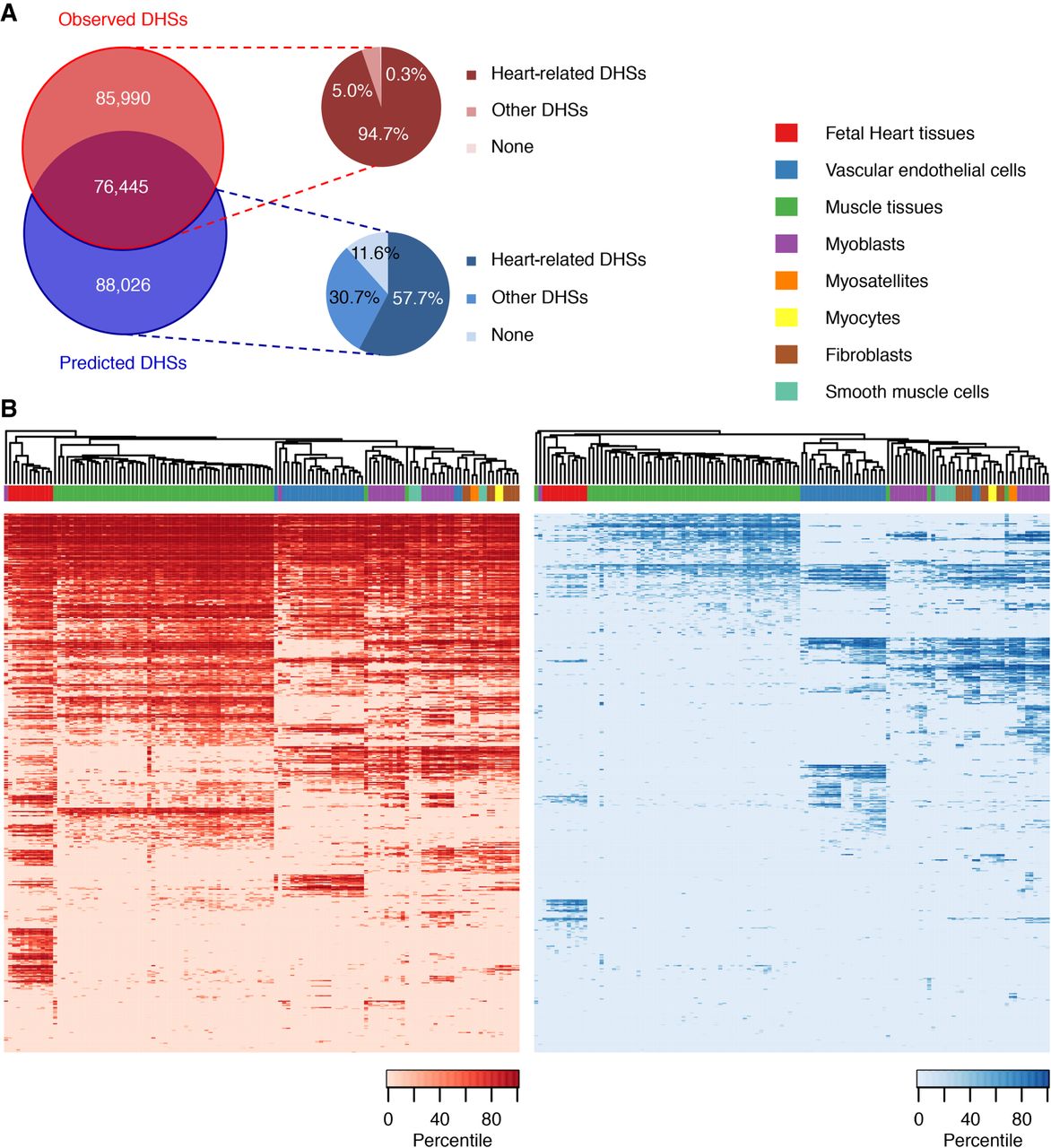 Learned sequence features predict additional CREs. (A) Venn diagram of observed and predicted DHSs and their proportions in noncardiac cell types. (B) Heat map of DHS signal intensities in heart-related cell types and tissues at observed (left) and predicted (right) DHSs. Randomly sampled 5000 regions from observed and predicted DHSs were used. Observed DHSs are mostly located in ubiquitously open chromatin regions in cardiac-relevant cells and tissues, while predicted DHSs show greater cell-type specificity.