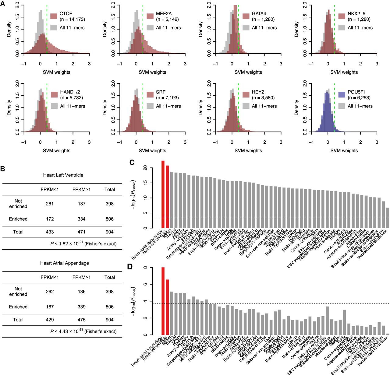 Learned sequence features identify cardiac TFs. (A) SVM weight distributions of PWM-matched 11-mers for the top two scoring TFs (CTCF and MEF2A), five well-known cardiac-specific TFs (GATA4, NKX2-5, HAND1, HAND2, SRF, and HEY2), and a cardiac-irrelevant TF (POU5F1). The fifth percentile is shown as a green line. The enrichment is defined as the fraction of TFBS-matching 11-mers in the top fifth percentile of all 11-mers compared to the expected fraction (5%). (B) 2 × 2 contingency tables comparing TFs enriched in heart DHSs with TFs expressed in heart left ventricles (top) and atrial appendages (bottom). (C,D) −log10(P) of one-sided Fisher's exact test for every tissue tested using all TFs (C) and after removing commonly expressed TFs (D); the two tissues from adult heart (atrial appendage and left ventricle) are highlighted in red with the Bonferroni-corrected P-value threshold (0.05) shown as a dashed line.