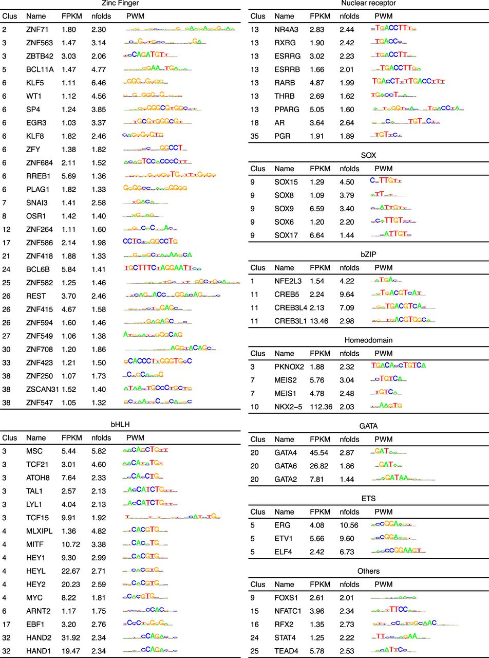 A list of 78 TFs enriched in heart DHSs as well as selectively expressed in cardiac tissues. The 78 TFs were grouped based on their DNA binding domain families. These PWMs were also clustered based on their sequence specificity. For each TF, cluster number (Clus), name, gene expression (FPKM) in left ventricle, fold enrichment (nfolds), and PWM are shown, respectively.