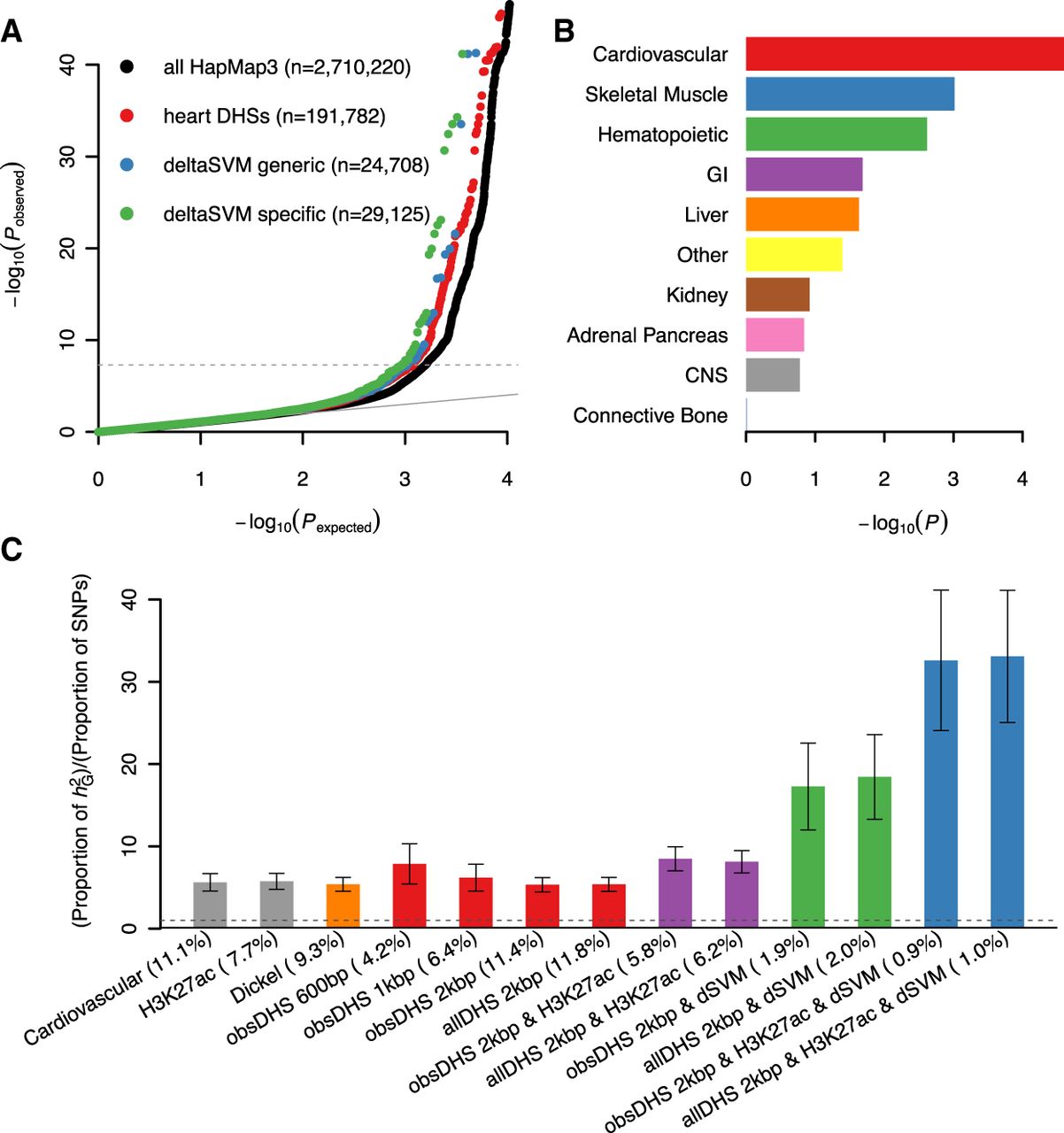 Cardiac regulatory variants explain QT-interval heritability. (A) Q-Q plots of QTi GWAS results using different subsets of common genome-wide sequence variants (numbers of variants in parentheses); the dashed gray line indicates the genome-wide significance threshold (P < 5 × 10−8). (B) Comparison of enrichment P-values between 10 predefined cell-type group functional annotations. (C) Enrichment values, estimated as the fraction of the heritability (hG2) explained by variants over the fraction of the SNPs, for various heart DHS-based annotations. (Cardiovascular) the predefined cell-type group functional annotation for cardiovascular tissues, (H3K27ac) H3K27ac marks in heart, (Dickel) heart CRE map from Dickel et al. (2016), (obsDHS 600 bp) observed DHSs, (obsDHS 1 kb/2 kb) observed DHSs with 1-kb/2-kb extension, (allDHS 2 kb) observed and predicted DHSs with 2-kb extension, (dSVM) deltaSVM predicted variants. A combination of multiple annotations indicates intersection of them. For example, “obsDHS 2 kbp & dSVM” means a set of variants predicted by deltaSVM and overlapping observed DHSs with 2-kb extension. The proportion of SNPs are in parentheses; error bars denote standard errors estimated by a block Jackknife method; no enrichment is shown as a dashed line.