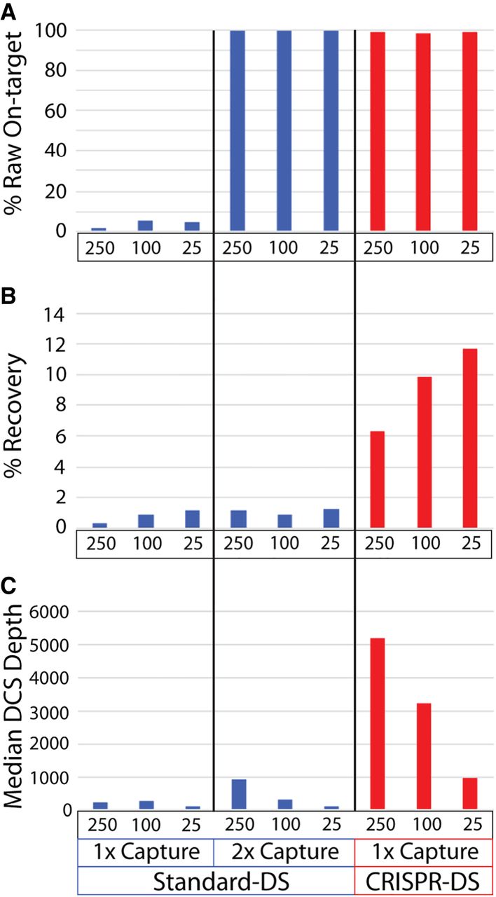 Technical comparison of 250, 100, and 25 ng of DNA sequenced with both standard-DS and CRISPR-DS. Measurements were obtained by sequencing samples prepared with standard-DS (blue) using one and two rounds of hybridization capture and CRISPR-DS (red) with only one round of hybridization capture. (A) The percentage of raw sequencing reads on-target (covering TP53) post-capture(s) was comparable between standard-DS with two rounds of capture and CRISPR-DS with one round of capture, demonstrating the target enrichment efficiency of the novel method. (B) Percentage recovery was calculated as the percentage of genomes in input DNA that produced DCS reads. CRISPR-DS increases recovery thanks to the initial CRISPR-based target enrichment, which eliminates one round of hybridization capture. (C) After creating DCS reads, the median DCS depth across all targeted regions was calculated for each input amount. The increased recovery enabled by CRISPR-DS translates into five to ten times more sequencing depth for the same input DNA.