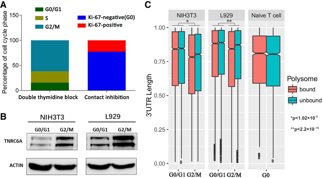 Cell cycle and translational efficiency. (A) The percentage of cells in a cell cycle phase of the NIH3T3 cell line after cell synchronization with a double thymidine block and release, and contact inhibition. (B) Western blot analysis shows higher expression of TNRC6A in the G2/M phase in the NIH3T3 and L929 cell lines. (C) Notched box plot of the weighted mean of the 3′ UTR length for NIH3T3 and L929 cells obtained by synchronization, and naïve T cells. Cells at the G2/M but not G0/G1 phase show a higher translational efficiency of mRNA with a shorter 3′ UTR.