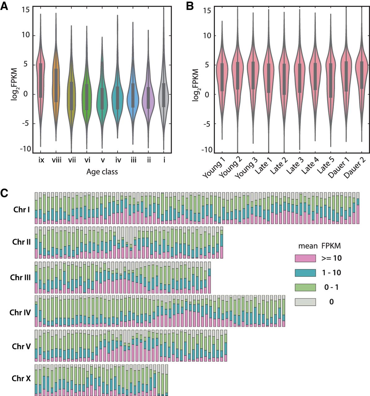 Expression increases over time. (A) Expression values for P. pacificus genes from different age classes in an RNA-seq data set of late larvae and adults (Late 1) indicate that older age classes are expressed at higher levels. (B) Age class ix genes are expressed at a constitutively high level in all 10 developmental transcriptomes. (C) Distribution of expression classes across the P. pacificus chromosomes.