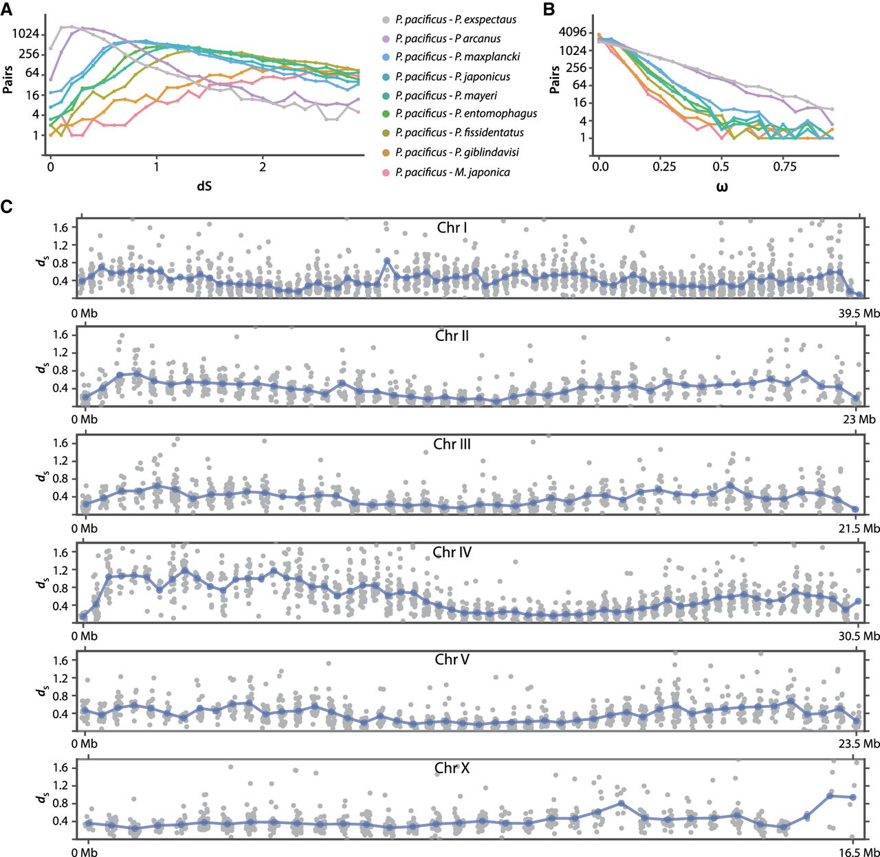 Divergence estimates across different time scales and their chromosomal distribution. (A,B) Pairwise dS (A) and ω (B) distribution between P. pacificus and all other species support the underlying species phylogeny (Susoy et al. 2016). (C) dS value of each 1:1 ortholog between P. pacificus and P. exspectatus were mapped on the P. pacificus chromosomes with a running mean for each window (in blue).