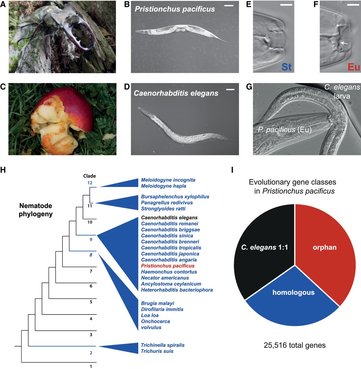 Comparison of Pristionchus pacificus and Caenorhabditis elegans and phylogenetic relationship. (A,B). P. pacificus is often found in a necromenic relationship with insect hosts, preferentially scarab beetles, in the dormant dauer state. When the beetle dies, worms exit the dauer stage to feed on bacteria that bloom on the decomposing carcass. (C,D) C. elegans, the classic nematode model organism, is often found in leaf detritus and rotting fruits. Example rotting apple photo taken by M.S.W. (E–G) P. pacificus has become an important model for developmental (phenotypic) plasticity. Adults can adopt (E) a narrow mouth form with one tooth (stenostomatous [St]) that makes them strict bacterial feeders. However, the “boom-and-bust” life cycle creates significant competition for resources, and under crowded conditions adults can develop an alternative mouth form (F) with a wider buccal cavity and an extra tooth (eurystomatous [Eu]) that allows them to prey on other nematodes. (G) Shown here is a eurystomatous P. pacificus preying on a C. elegans larva. (H) A schematic phylogeny of nematodes that was generated based on the publications of Holterman et al. (2017) and Van Megen et al. (2009). (I) Breakdown of P. pacificus genes by evolutionary category: One-to-one orthology with C. elegans (C. elegans 1:1) is the most conserved, followed by genes sharing homology with at least one gene from the 24 other nematodes (homologous), and finally genes that are only found in Pristionchus (orphan). All categories were defined by BLASTP homology (e-value ≤0.001) (Methods).