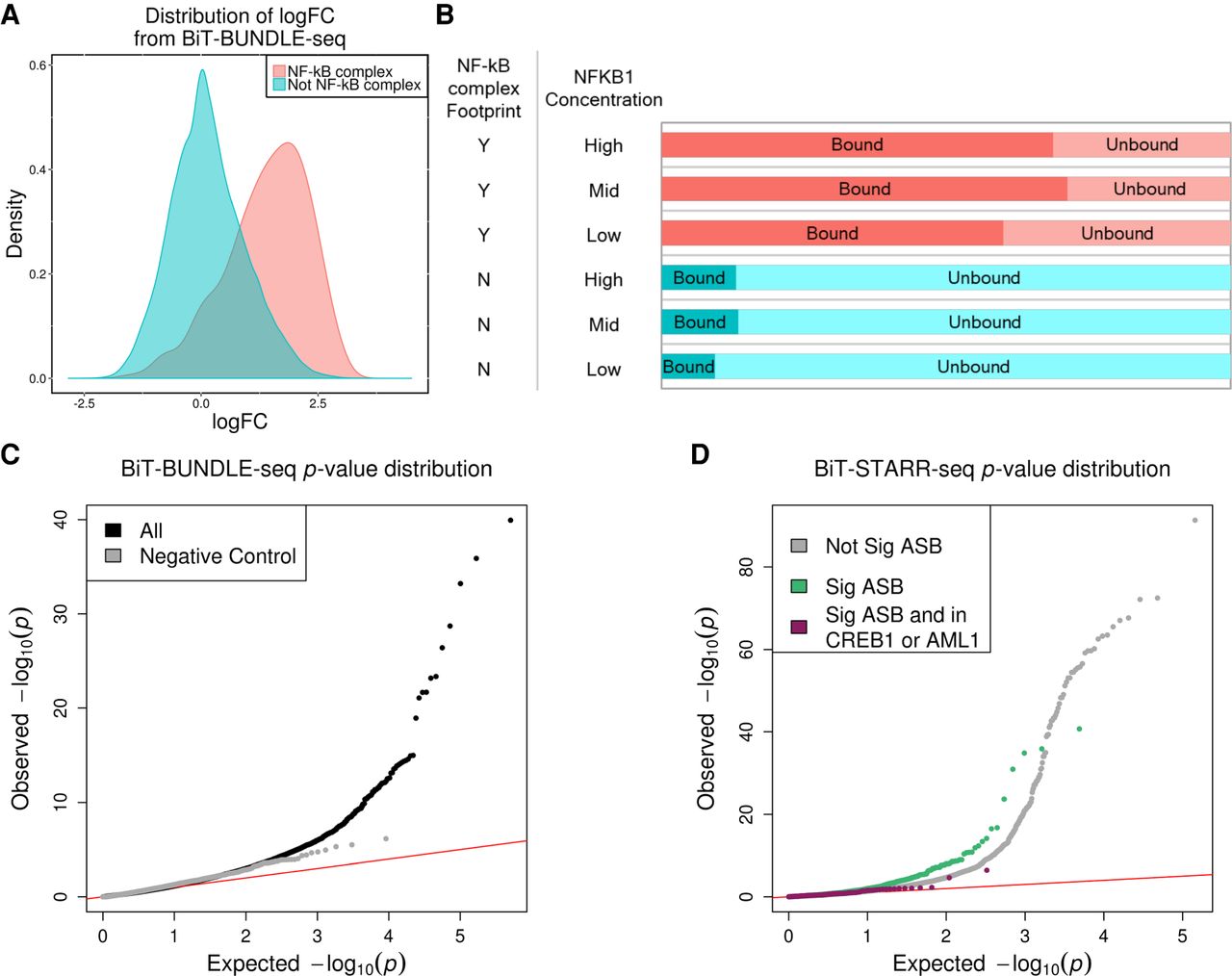 Allele-specific binding for NFKB1. (A) Density plot of the logFC (from DESeq2) between bound and unbound DNA fractions from the BiT-BUNDLE-seq experiment. Regions in red are those containing a SNP in a NF-κB complex footprint; regions in blue are those containing a SNP in footprints for other transcription factors. (B) Bar plot representing the number of independent enhancer regions in bound (dark color, DESeq2 logFC > 1 and FDR < 1%) and unbound (light color) DNA. NFKB1 concentration and presence of a NF-κB complex footprint are indicated in the two columns on the left of the panel. (C) QQplot depicting the P-value distributions from testing for ASB signal specific to the bound DNA fraction using ΔAST (black) and SNPs in the negative control group (gray). (D) QQplot depicting the ASE p-value distribution from QuASAR-MPRA for SNPs with significant (FDR < 10%) ASB (green), SNPs with significant (FDR < 10%) ASB and are also in CREB1 or AML1 footprints (maroon), or not significant ASB (gray) in the BiT-BUNDLE-seq experiment.