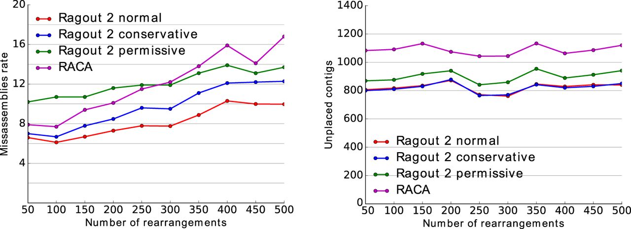 Benchmarking RACA and different Ragout 2 strategies using the simulated human Chr 14 assembly. A target and three reference genomes were simulated by randomly distributing the corresponding number of rearrangements along the branches of a phylogenetic tree. In addition to the normal Ragout 2 run, we performed the “permissive” run in which all target-specific adjacencies are accepted and the “conservative” run in which all target-specific adjacencies are broken. (Left) Misassembly rate between the ordered contigs, computed relative to the complete simulated sequence. (Right) The number of unplaced contigs (missing in the assembled chromosomes). Each data set contains approximately 5000 contigs with a mean length of 18,000 bp.