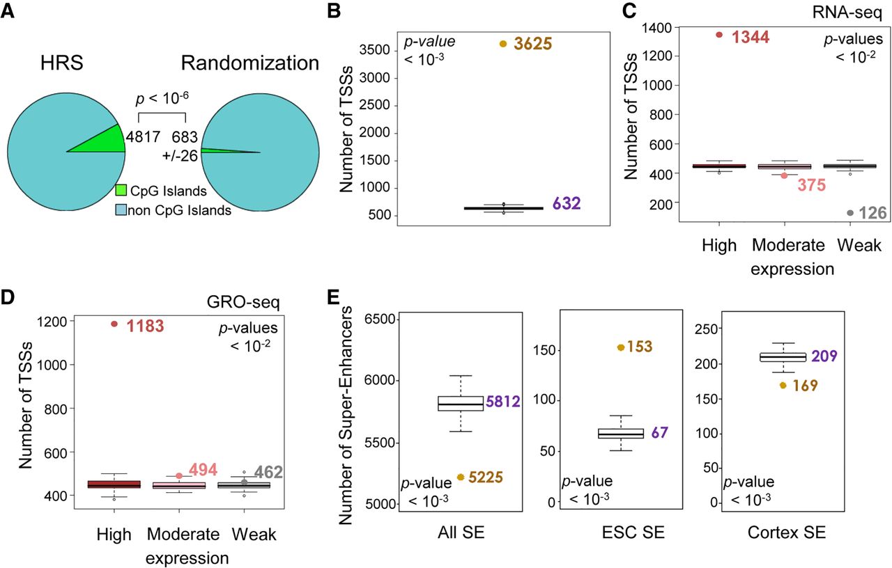 HRSs are associated with active genes and super-enhancers. (A) The number of HRSs that overlap with CpG islands (UCSC, mm9 build) was counted (4817; left) and compared to the mean counts (623 ± 26, SD) obtained from “random permutation tests” with n = 1000 random resampling (1000 sets of equivalent number of random StyI fragments; right). The P-value indicates the significance of the difference between the counts obtained for HRSs versus 1000 randomizations. (B) The number of TSSs that map into the ESC HRS set was counted (brown dot). This number was compared to the counts obtained from “random permutation tests” with n = 1000 random resampling (1000 sets of 61,080 random StyI fragments; box plots, median value obtained from randomizations is indicated in purple). The P-value indicates the significance of the difference between the counts obtained for HRSs versus 1000 randomizations. (C) Based on RNA-seq data available from ESCs (Wamstad et al. 2012), mouse genes were classified into three sets. The first set corresponds to the 3000 genes having the highest expression levels, the second to 3000 moderately expressed genes, and the last to the 3000 genes with the weakest expression levels (mean of two replicates). For each set, the number of HRS-associated genes were counted and compared with the counts obtained for equivalent numbers of genes taken at random. The P-value indicates the significance of the difference between the counts obtained for HRSs versus 100 randomizations (box plots). It is valid independently for the differences observed in the highly and weakly expressed gene sets. (D) Identical analysis as described above in C was performed using ESC GRO-seq data (Min et al. 2011). (E) The numbers of super-enhancers (Khan and Zhang 2016) that overlap with the ESC HRSs (brown dots) were counted for all super-enhancers known in the mouse genome (left) and for those that are active in ESCs (middle) or in the cortex (right). These numbers were compared to “random permutation tests” (1000 random sets of 61,080 StyI fragments; box plots, median value indicated in purple). The P-value indicates the significance of the difference between the counts obtained for HRSs versus 1000 randomizations.
