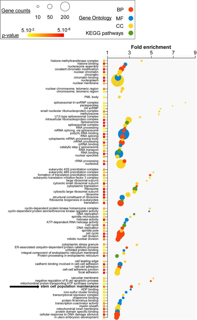 HRS-associated genes are housekeeping, as well as cell-type–specific, genes. DAVID Gene Ontology analyses were performed on genes for which at least one TSS was mapping in the ESC HRSs. KEGG pathways (green) and GO terms related to biological processes (red), molecular functions (blue), and cellular components (yellow) are depicted by circles as a function of fold enrichments. For each indicated term, circle areas are proportional to gene counts. Only the most significant terms (P-value <0.05 and fold enrichment >1.80) are shown. P-values <5 × 10−6 are depicted by red squares (for exact values, see Supplemental Table S4).