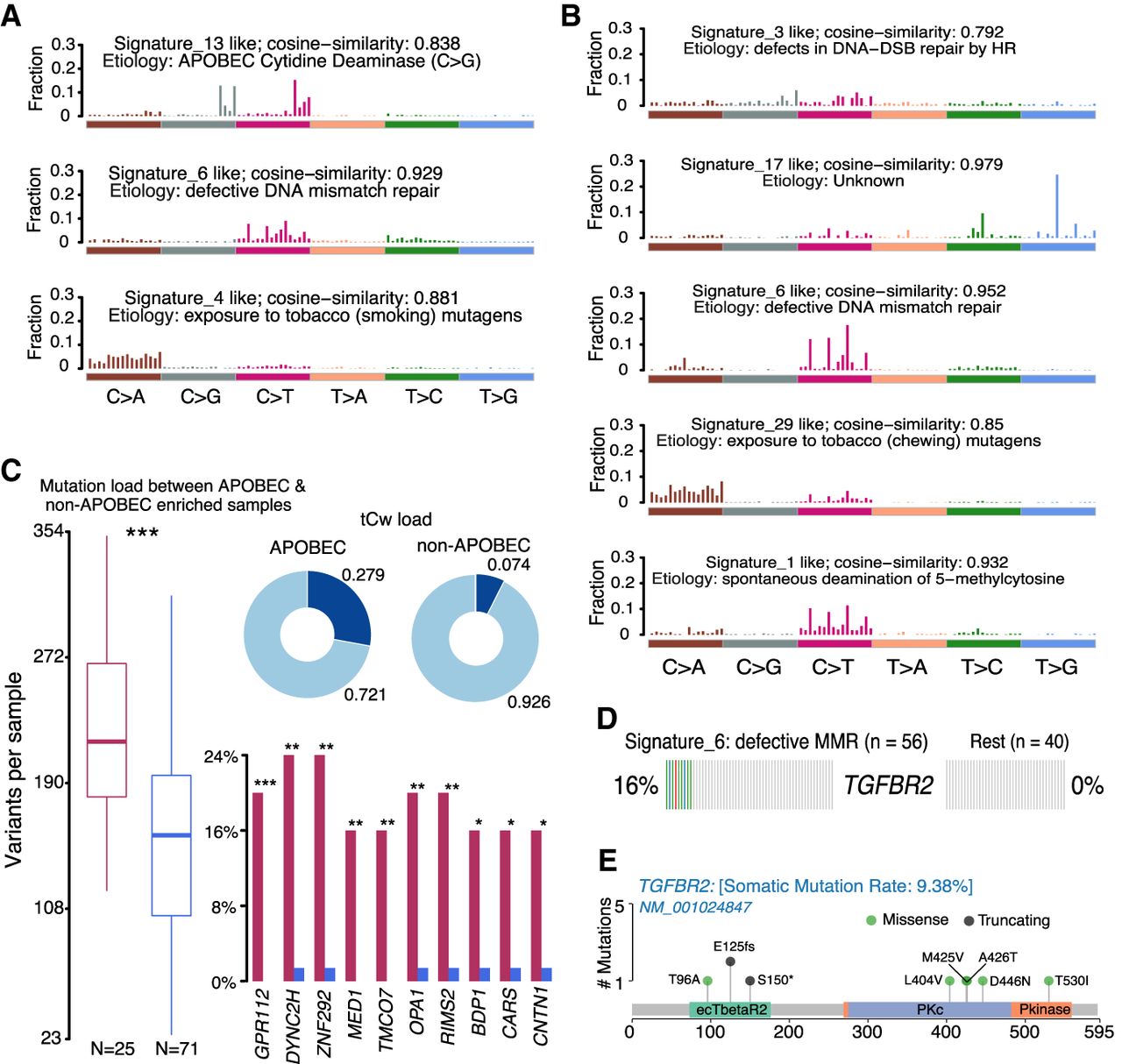 Signature and APOBEC enrichment analysis. (A,B) Mutational signatures identified in ESCC and EAC, respectively. The y-axis indicates exposure of 96 trinucleotide motifs to overall signature. The plot title indicates best match against validated COSMIC signatures and cosine similarity value along with the proposed etiology. (C) Results from the APOBEC enrichment analysis in ESCC. The box plot shows differences in mutation load between APOBEC-enriched and nonenriched samples: (***) Wilcoxon rank-sum test; P < 0.001. Donut plots display the proportion of mutations in tCw context. Bar plots show the top 10 differentially mutated genes between APOBEC-enriched and non-APOBEC-enriched samples: (***) P < 0.001; (**) P < 0.01; (*) P < 0.05, Fisher's exact test. (D) Enriched TGFBR2 mutations in ESCC among samples associated with defects in DNA mismatch repair signature (COSMIC Signature 6). (E) Lollipop plot showing the distribution of mutations in TGFBR2 and truncating mutations (frameshift deletions and splice site) in the BETR2 domain.