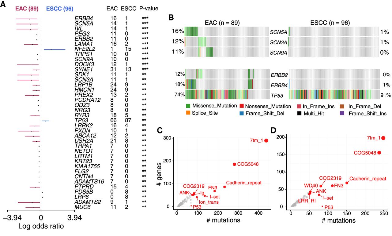Cohort comparison and domain enrichment analysis. (A) Differentially mutated genes between EAC and ESCC displayed as a forest plot. Bars indicate 95% confidence interval of odds ratio. The adjacent table includes the number of samples in EAC and ESCC with the mutations in the highlighted gene. P-value indicates significance threshold: (***) P < 0.001; (**) P < 0.01; Fisher's exact test. (B) Mutated pathways involving genes associated with VGSC and ERBB signaling in EAC. Genes associated with these pathways are preferentially enriched in EAC, mutated in a mutually exclusive manner. (C,D) Frequently mutated pfam protein domains in EAC and ESCC, respectively. The top ten domains are highlighted. Bubble sizes are proportional to the number of genes containing the highlighted domain. Ion_trans domain is largely mutated in EAC.