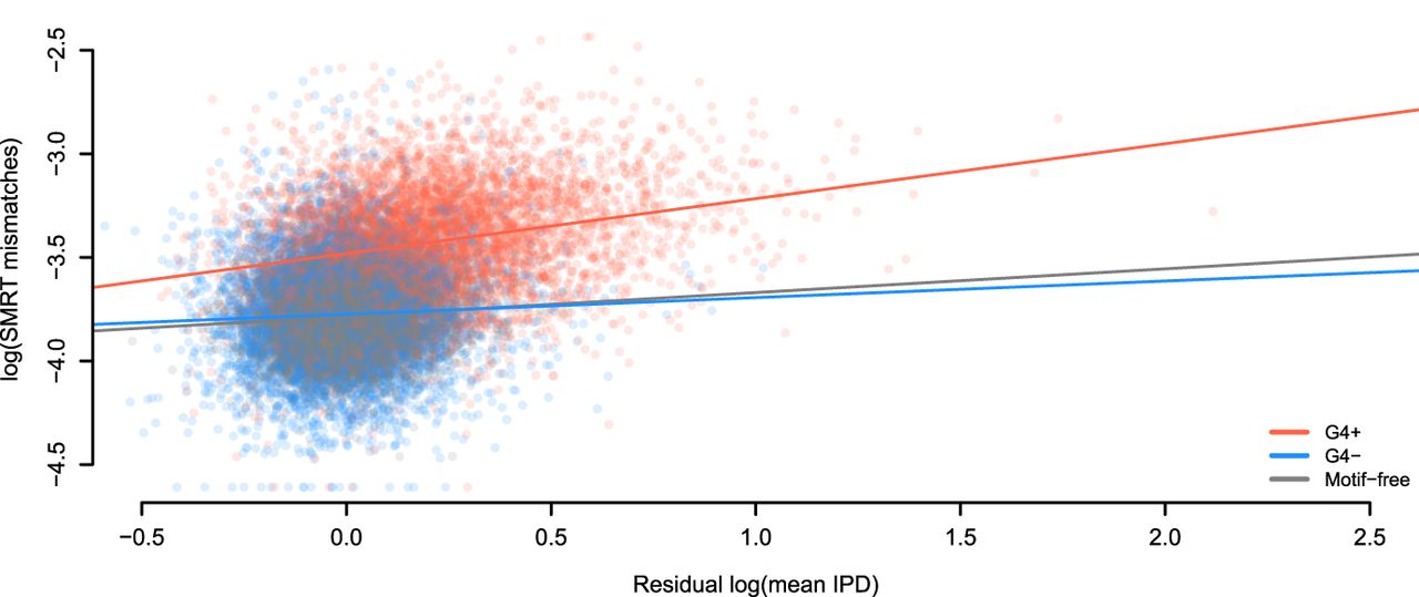 Errors are linked to kinetic variation. Sequencing through templates containing G-quadruplex motifs (G4+) increases the positive relationship between mismatches in SMRT sequencing and IPD values (corrected for sequence composition). This does not occur when sequencing through the reverse complement of G-quadruplex motifs (G4−). The regression model accounting for three groups of regions (G4+, G4−, and motif-free windows) has R2 equal to 35.4%. Slopes are 0.26, 0.08, and 0.11 for G4+ motifs (N = 5937), G4− motifs (N = 5695), and motif-free windows (N = 11,632, which is the sum of samples sizes for G4+ and G4−), respectively.