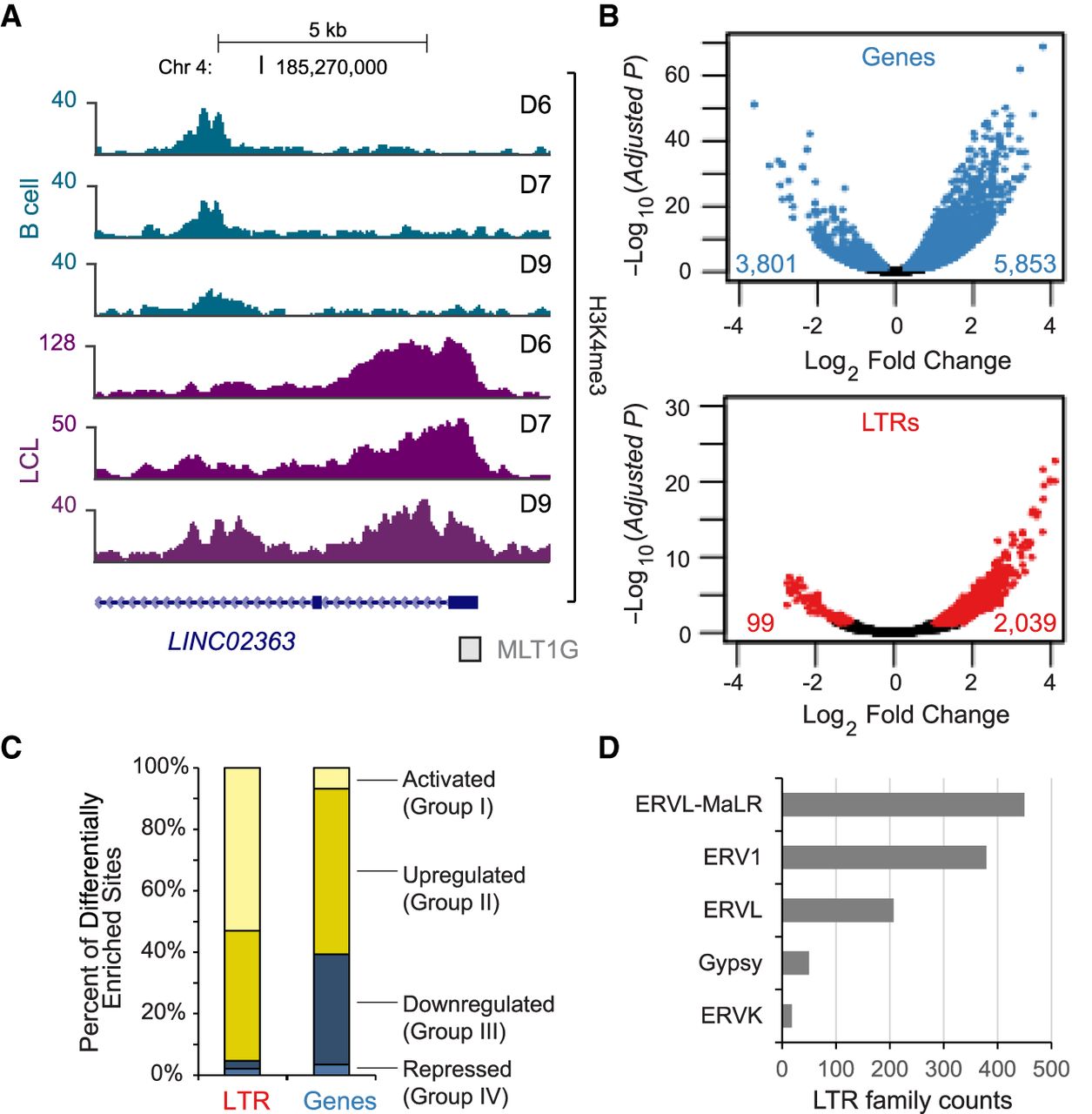 EBV-induced transformation of B cells activates LTRs. (A) Genome browser tracks of H3K4me3 profiles at LINC02363, a long noncoding gene, with the MLT1G LTR at the transcriptional start site (TSS). (B) Volcano plots of normalized H3K4me3 read counts in LCLs relative to B cells at TSSs of genes (top) and at LTRs (bottom). (C) Percentage of differentially enriched H3K4me3 LTRs and genes classified as “activated,” “up-regulated,” “down-regulated,” and “repressed.” (D) Enumeration of the LTR families that are activated in LCLs (Group I).