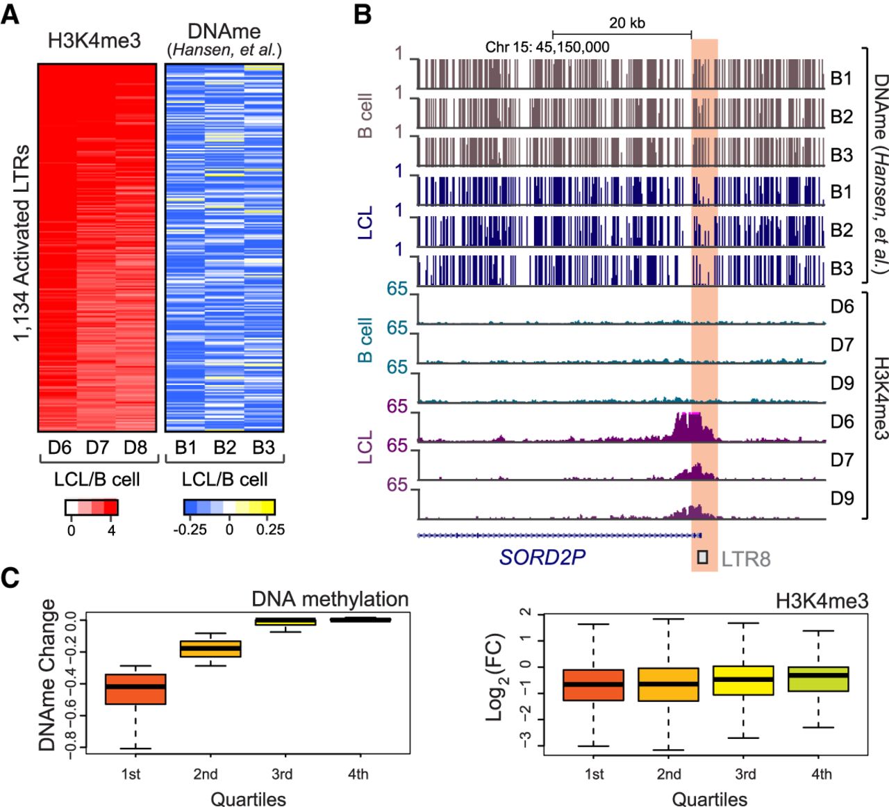 Activated LTRs are hypomethylated in LCLs. (A, left) Heatmap of H3K4me3 in three B cell donors and three matched LCLs at activated LTRs; (right) heatmap of DNA methylation changes in matched B cells and LCLs at activated LTRs. (B) Genome browser tracks of DNA methylation and H3K4me3 profiles in B cells and LCLs at a SORD2P locus driven by an LTR8. (C) Boxplot of DNA methylation changes (left) and H3K4me3 change (right) between B cells and LCLs stratified into quartiles based on DNA methylation change.