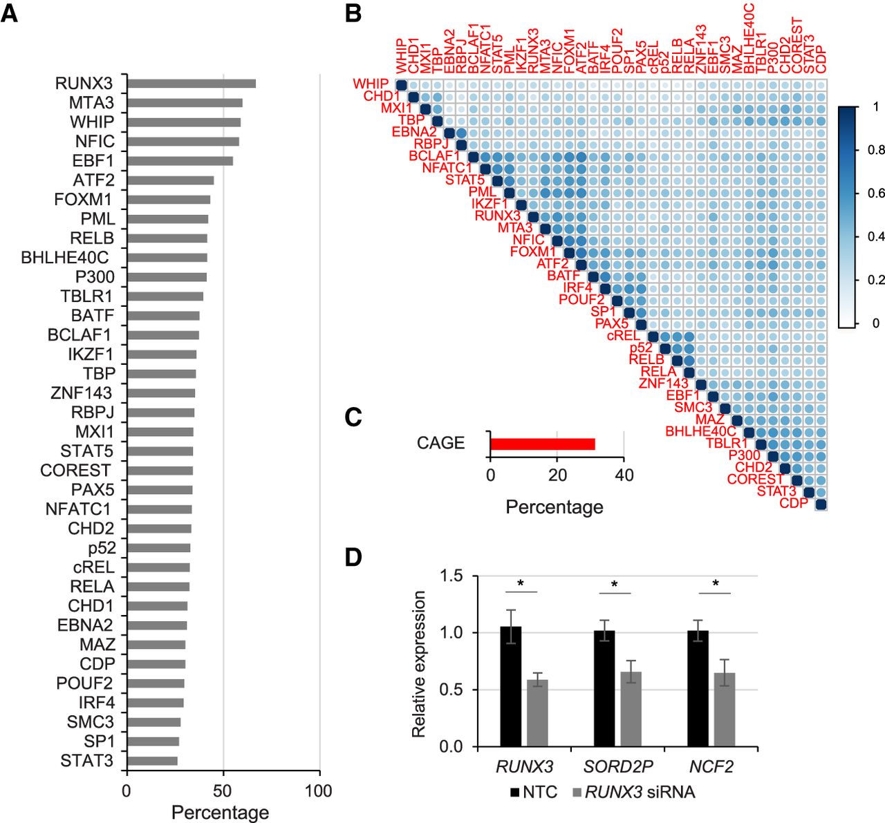 Activated LTRs are binding sites for many transcription factors in GM12878 cells and can promote transcription. (A) Bar graphs of the percentage of activated LTRs bound by each transcription factor. (B) Correlation plots (Pearson's) of transcription factor co-occupancy at EBV-activated LTRs. Hierarchical clustering was performed to identify transcription factors that co-occur. (C) Percentage of activated LTRs with CAGE sequences in GM12878 cells, indicating promoter activity. (D) RT-qPCR of RUNX3, SORD2P, and NCF2 transcripts after siRNA knockdown of RUNX3 transcripts. (*) P < 0.05.