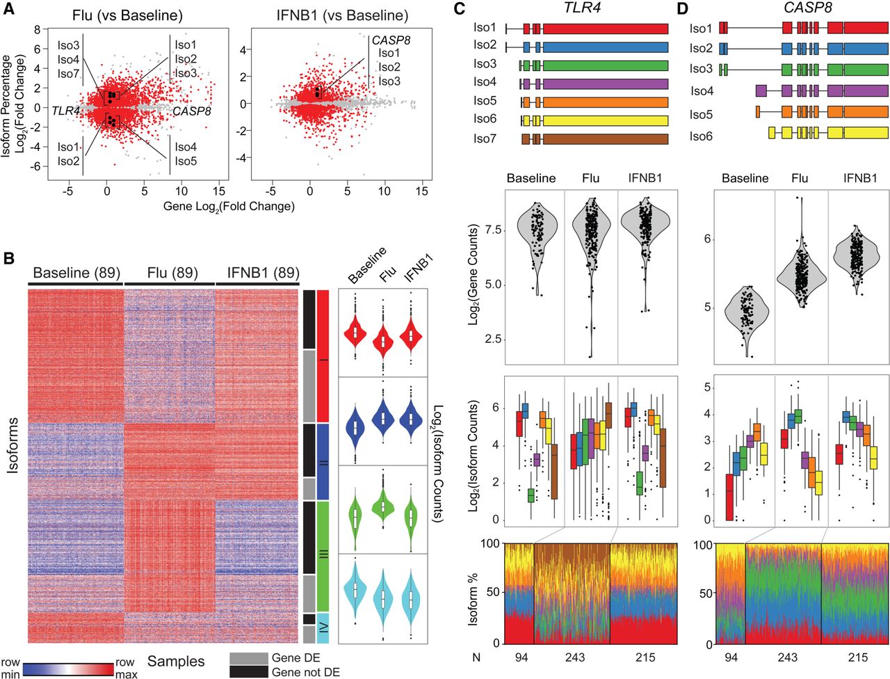 Transcriptome changes in response to stimulation. (A) Scatter plot of log2 fold change of gene abundance (x-axis) versus log2 fold change of isoform usage percentage (y-axis) in flu-infected (left) and IFNB1-simulated (right) cells compared with baseline. Each dot represents one isoform. Isoforms that significantly differed in their usage (beta regression, FDR < 0.05) are highlighted in red. (B) Clustering of isoform usage ratios in baseline, flu-infected, and IFNB1-stimulated cells. Heatmap colors are row scaled (red indicates row maximum, blue indicates row minimum; left). Violin plots (right) summarize the usages of all isoforms within a cluster separated by condition. Only isoforms (one per gene) that most significantly changed (beta regression, FDR < 0.05) in usage are shown. (C,D) De novo constructed isoforms (top), gene abundance (second row), and isoform abundance (third row) and usage percentage (bottom) for TLR4 (C) and CASP8 (D).