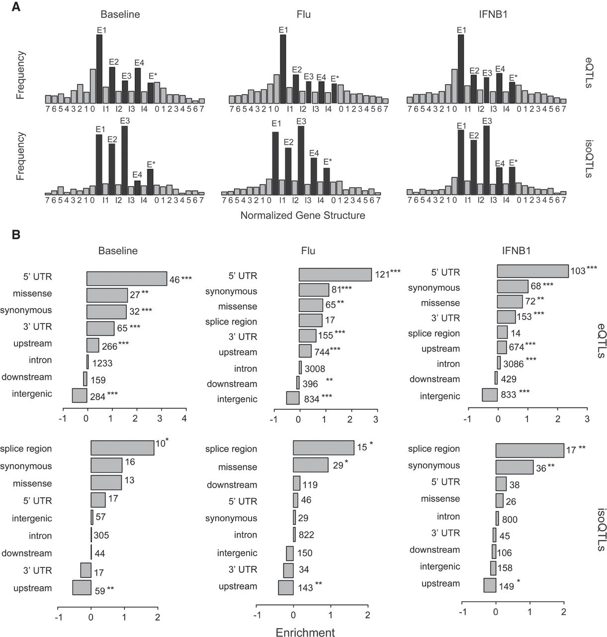 Properties of local eQTLs and isoQTLs. (A) Frequency (y-axis) of the location of leading SNPs for local eQTLs and isoQTLs (permutation FDR < 0.05) with respect to meta gene structure (x-axis). Genes are normalized to five exonic regions (E1–E4 indicate exons 1 through 4; E* indicates exon 5 to the last exon) and four intronic regions (introns 1, 2, 3, and from intron 4 to the last intron). Upstream and downstream sequences are divided into 100-kb windows. (B) Log2 fold enrichment (x-axis) of leading SNPs for local eQTLs and isoQTLs (permutation FDR < 0.05) for genomic annotations. eQTL enrichments are calculated using a background set of SNPs matched for distance to TSS and allele frequency. IsoQTL enrichments are calculated with respect to a background set of eQTLs matched for distance to TSS and allele frequency. Multiple testing significance is indicated. (*) P < 0.05; (**) P < 0.01; (***) P < 0.001.