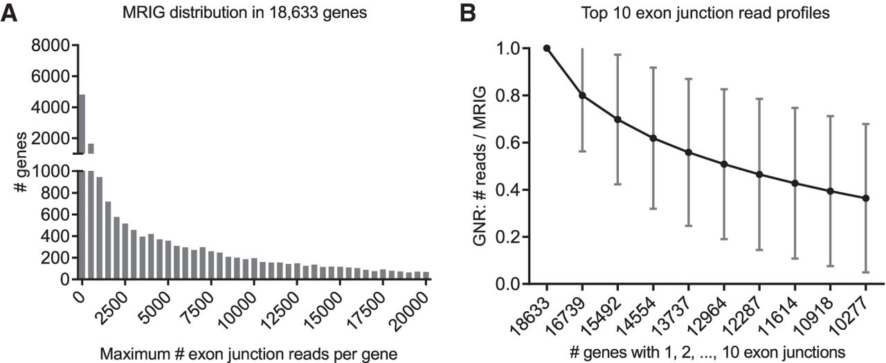 Distributions of 269,360 exon junctions in 18,633 genes. (A) Distribution of the maximum number of reads on a single exon junction (MRIG) for all 18,633 genes. (B) Profile for top 10 numbers of reads on a single exon junction (mean ± SD). For each gene, exon junctions were ordered by their reads, then normalized by their respective maximum reads in each gene (MRIG) to obtain gene-normalized reads (GNR). Axis labels show the number of genes with at least 1, 2, …, 10 exon junctions. There were, for example, 16,739 genes with two or more exon junctions, and the second highest exon junctions had average GNR of 80%.