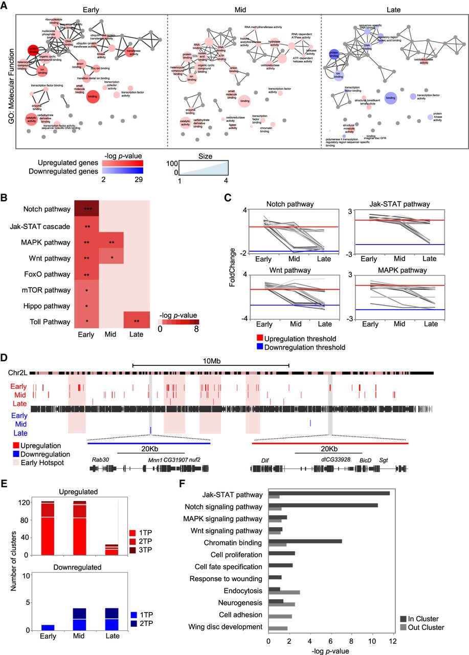 Genomic clustering of differentially expressed genes. (A) Gene Ontology term enrichment of differentially expressed genes at successive time points visualized by ReviGO. The size of the circles denotes the number of genes; circle color indicates the P-value of each term. Highly similar GO terms are linked by edges in the graph. (B) Heatmap of pathway enrichment in the set of up-regulated genes at each time point. The level of significance is denoted: (*) P < 0.05; (**) P < 10−2; (***) P < 10−3. (C) Line plots showing expression changes over time of genes that belong to signaling pathways significantly enriched in regeneration. Expression is shown as fold change between control and regeneration at each time point. Each gene is plotted as a single line. (D) Genomic map of clusters of differentially expressed genes on Chromosome 2L. Each red or blue box represents a single cluster; the size of each box denotes the length of the cluster. The magnified regions show one down-regulated cluster (blue, left) and one up-regulated cluster (red, right). Hotspots at the early stage are highlighted in pink. (E) Bar plot showing the number of clusters identified at only one time point, at two time points, and at all three time points. (F) Gene Ontology term enrichment for the set of up-regulated genes located inside or outside the clusters at early regeneration. All the categories plotted are significant in at least one group of genes (the absence of a bar denotes no enrichment in that group).