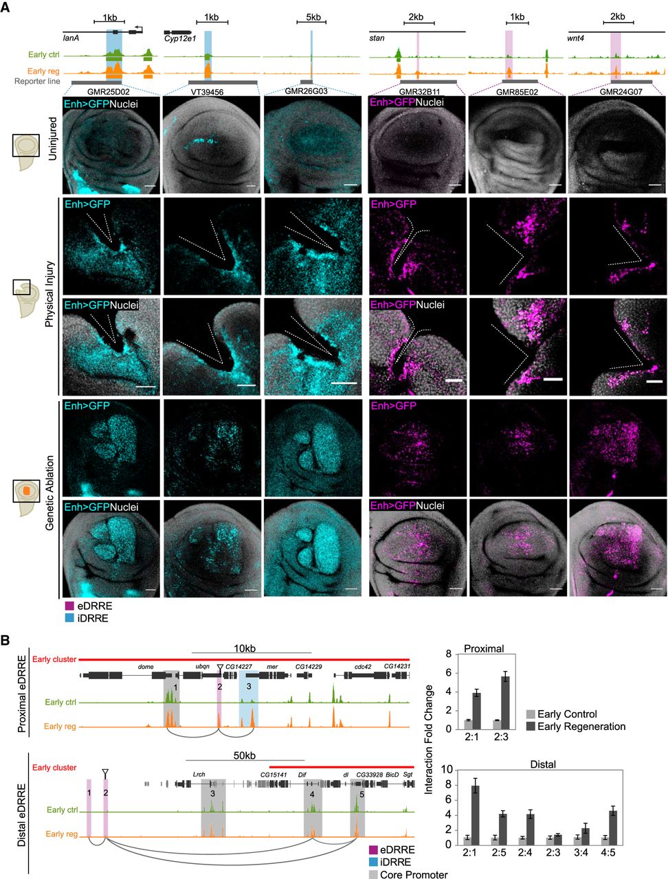 Validation of the activity of DRREs after damage. (A) Validation of enhancer regions after induction of cell death or physical damage using reporter lines. Genome Browser screenshot showing the ATAC-seq profile (control and regeneration) at the early stage of regeneration of validated enhancers (highlighted in blue if iDRRE; purple if eDRRE), and the region covered by the reporter line in gray (top). Confocal images of wing discs showing enhancer activity as GFP intensity (blue if iDRRE; purple if eDRRE) and nuclei in gray (bottom). The injury domain is shown in a schematic drawing on the right. In cell death-induced discs, GFP labeling is located in the apical section, where living cells cover the apoptotic zone. (B) Genome Browser screenshots at the early stage highlighting regions used for 3C analysis (left). Arrows indicate the eDRRE peaks used as bait. qPCR-3C analysis showing interaction levels between eDRREs and both CP and iDRRE (right). 3C results are presented as the fold change of the interaction between control and regeneration. Error bars represent the standard error of the mean from two biological replicates. Positive interactions after damage are marked as connectors in the Genome Browser screenshot.