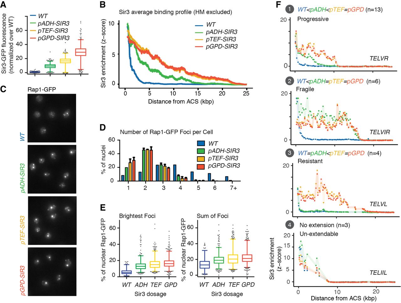 Increasing Sir3 dosage leads to telomere clustering and Sir3 spreading saturation. (A) Quantification of Sir3 levels by integration of Sir3-GFP signal in strains expressing SIR3-GFP under different promoters as indicated. (B) ChIP-chip against Sir3 was carried in strains expressing SIR3 under different promoters as indicated. Moving average of Sir3 binding (block = 1000 bp, window = 10 bp) at telomeres (with the exception of TELIIIL and TELIIIR that contain HM loci) as a function of distance from the ARS consensus sequence (ACS) within the last telomeric element. Enrichment is shown as the standardized IP over Input (see Methods). (C) Rap1-GFP foci grouping in strain differing for Sir3 levels. Cells were grown in YPD overnight, diluted to OD600 nm = 0.2 and imaged at OD600 nm = 1. (D) Quantification of Rap1-GFP foci distribution in images from C. (E, left) Distribution of Rap1-GFP signal attributed to the brightest foci in each nucleus; (right) distribution of the relative amount of Rap1 measured within foci relative to total nuclear Rap1 signal. (F) Stereotypical examples of Sir3 binding in function of Sir3 dosage. Enrichment corresponds to standardized Sir3 binding (Z-score). The number of subtelomeres within each group is shown in parentheses.