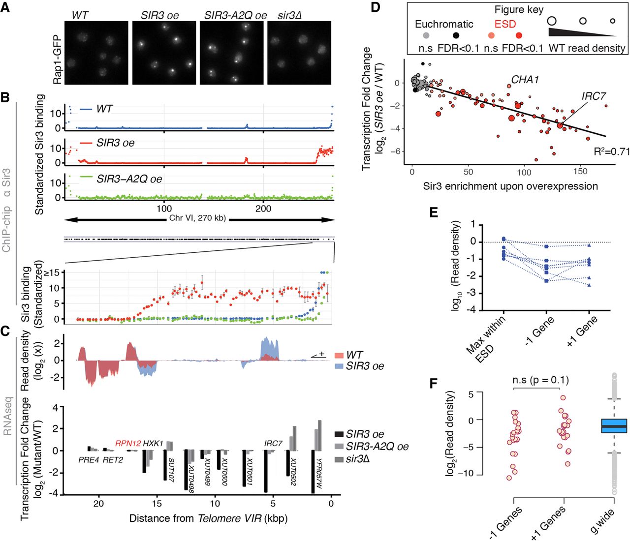 Sir3 extended domains are silenced and restricted to subtelomeres. (A) Representative Rap1-GFP images of exponentially growing strains with different Sir3 amount or expressing the SIR3-A2Q point mutant allele. (B) Chromosome-wide binding of Sir3 in the same strains as in A and blow-up on subtelomere VIR. Enrichment is shown as the standardized IP over input and scale is thresholded at 15 for visualization purposes. (C) Total RNA-seq read density and corresponding transcriptional fold change along subtelomere VIR in indicated exponentially growing (OD600 nm∼1) strains. (D) Sir3 binding and corresponding transcription changes of subtelomeric genes (distance from chromosome end <50 kb) upon overexpression of SIR3. Genes showing infinite fold change values were excluded from this plot. Color code indicates if a gene is annotated as within ESDs (see Methods) and shade indicates significance (FDR < 0.1) of the detected changes. Read density in WT cells is proportional to the disk area. Black line corresponds to linear fitting of the data, and corresponding R2 value is shown. (E) Exemplification of the seven subtelomeres at which a gene within the ESD shows larger transcript amount than the genes located at the end of the domain. (F) Read density of genes located before and after the end of extended silent domains compared to genome-wide distribution, statistical test: Wilcoxon test, paired values.