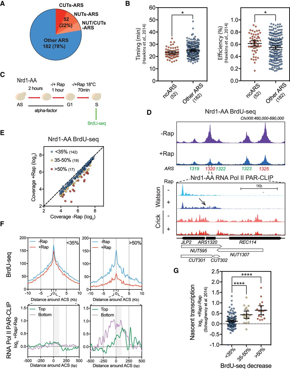 NUTs- and CUTs-containing ARSs are down-regulated when early termination of noncoding RNAs is abrogated. (A) Numbers and proportions of ARSs overlapping with CUTs only (red), NUTs only (orange), or both CUTs and NUTs (pink). ARS annotations used in this study are listed in Supplemental Table S1. CUTs and NUTs were considered as overlapping when showing 50 bp of overlap in the ACS to +100 bp area according to the ACS T-rich sequence. (B) Scatter dot-plot indicating the timing and efficiency of the noncoding RNA-containing ARSs (ncARSs) compared to replication origins devoid of overlapping CUTs and NUTs (Other ARSs). Timing and efficiency data were retrieved from Hawkins et al. (2013). The mean and the 95% confidence interval are indicated. (C) Nrd1-AA cells were synchronized in G1-phase with alpha-factor for 3 h at 30°C. During the last hour, rapamycin (Rap) was added or not in the medium. Cells were then washed and released into the cell cycle at 18°C in the presence of BrdU and −/+Rap. After 70 min, cells were collected for DNA extraction and BrdU-seq. (D) Snapshot depicting a part of Chromosome XIII for the BrdU-seq. Affected ARSs are indicated in red and nonaffected in green. Bottom panel shows a zoom around ARS1320 of the RNA Pol II PAR-CLIP in the Nrd1-AA strain (Schaughency et al. 2014). Transcriptional readthrough is indicated by an arrow. (E) Plot depicting the mean coverage of BrdU nascent DNA in a 5-kb window around ACS in −Rap versus +Rap. The 17 red dots and 19 yellow dots represent the ARSs showing at least 50% and 35%–50% decrease in BrdU incorporation in +Rap, respectively. Blue dots represent the ARSs defined as nonaffected in BrdU incorporation. (F) Top: Metagene analysis of the BrdU-seq for the 142 nonaffected ARSs (<35%) and the 17 most affected ARSs (>50%). Profiles represent the mean coverage smoothed by a 200-bp moving window. ARSs were oriented according to their ACS T-rich sequence. Bottom: Metagene profiles of the ratio log2 +Rap/−Rap of the RNA Pol II PAR-CLIP signal 500 bp around the oriented ACS of the least and most affected ARS (Schaughency et al. 2014). Plots were smoothed by a 10-bp moving window. Since ARSs are oriented, nascent transcription going toward replication origins is defined as Top and Bottom. The gray box represents the window in which transcriptional readthrough was analyzed in G. (G) Scatter dot-plots representing the ratio log2 +Rap/−Rap of the RNA Pol II PAR-CLIP signal over the three classes of ARSs defined in E. Total nascent transcription in +Rap and −Rap was defined on oriented ARSs by adding the RNA Pol II PAR-CLIP mean densities between the ACS to +100 bp on the top strand to the signal over the same region on the bottom strand in each condition using the data from Schaughency et al. (2014). Each 100-bp segment was considered as 1 bin (see Methods). (*) P-value < 0.05; (****) P-value < 0.0001.