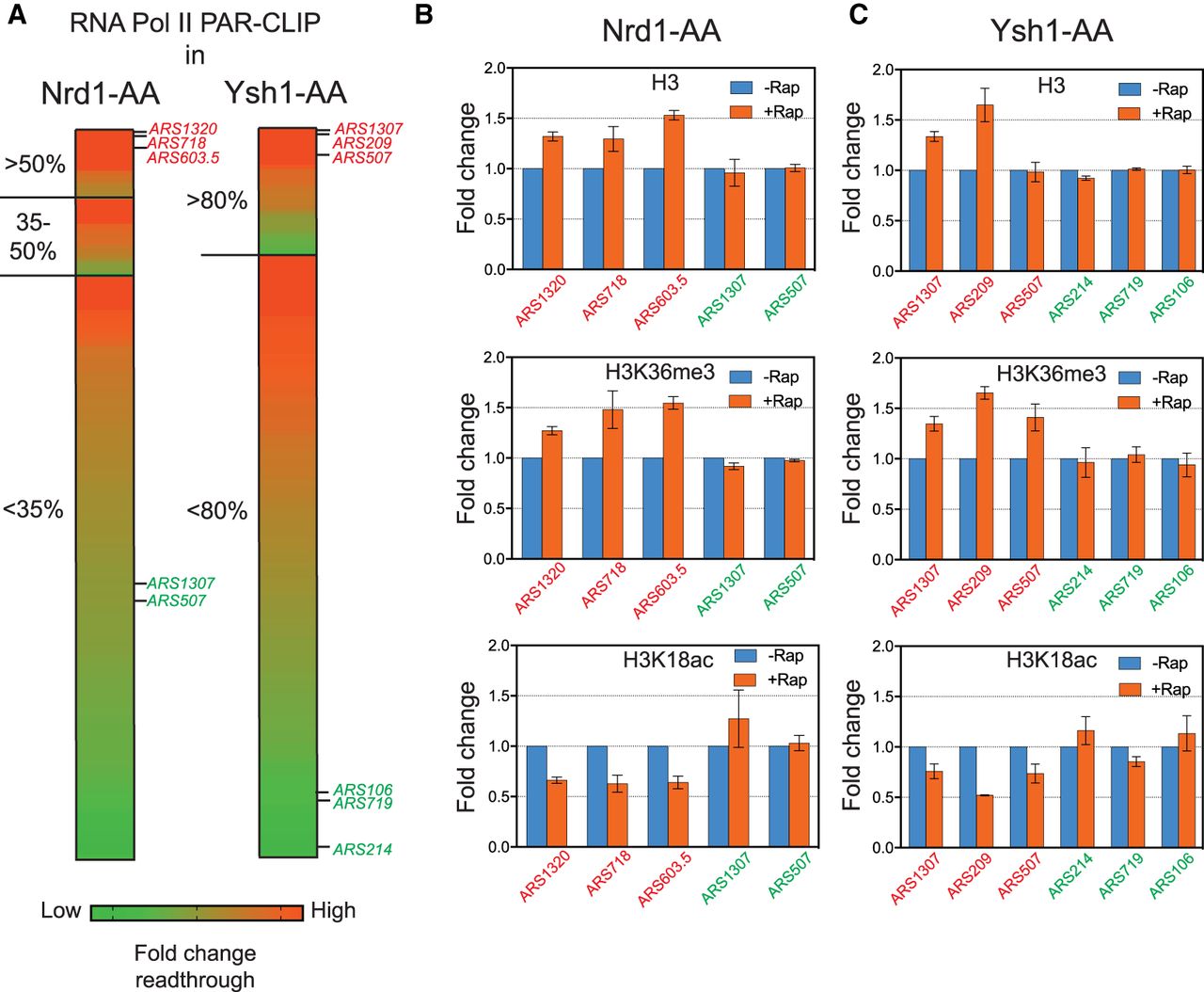 Noncoding and mRNA transcription readthrough at replication origins leads to chromatin changes. (A) Heat map representing the fold change of transcriptional readthrough at replication origins in Nrd1-AA and Ysh1-AA mutants. The 178 ARSs were classified according to their BrdU incorporation defects and ranked by their total readthrough increase over the ACS to +100 bp region. The three ARSs indicated in red for each mutant present a high increase in total readthrough. The ARSs depicted in green show mid or low total readthrough and have been used as controls for the following experiments. (B,C) Chromatin immunoprecipitation (ChIP) of H3, H3K36me3, or H3K18ac at ARSs with high (red) and low (green) readthrough transcription. Asynchronous cells were treated 1 h or 30 min with rapamycin to induce Nrd1 and Ysh1 depletion from the nucleus, respectively. ChIP was performed as described in Methods. Immunoprecipitated ARS loci were normalized to immunoprecipitated SPT15 ORF after qPCR amplification. Fold enrichment was artificially set to 1 for the −Rap condition (n = 3). Error bars represent the standard error of the mean (SEM).