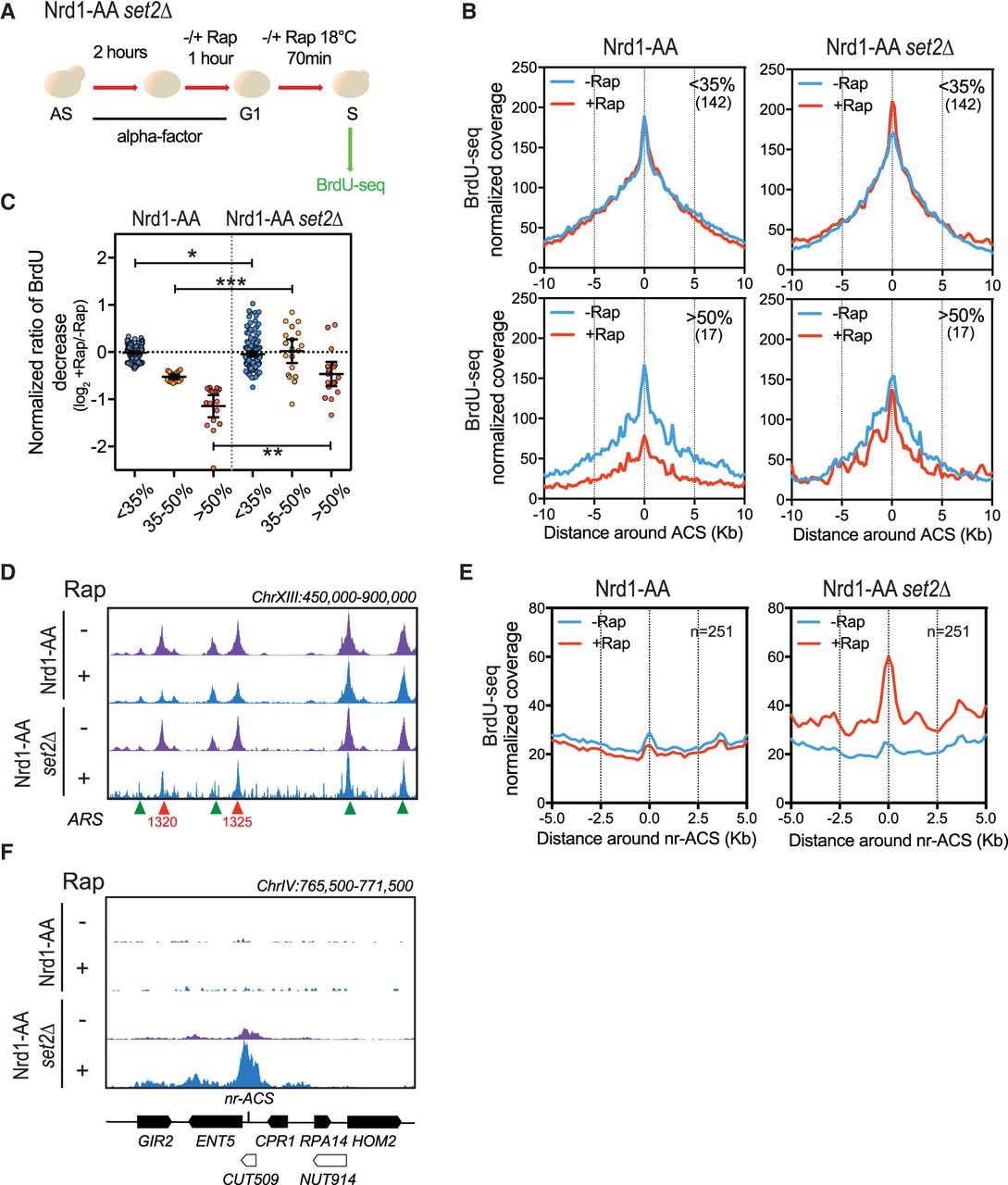 Absence of Set2 H3K36 methyltransferase partially rescues replication defects due to noncoding transcription readthrough. (A) Experimental scheme as described in Figure 1C. (B) Metagene analysis of the BrdU-seq for the 142 nonaffected ARSs (<35%) and the 17 most affected ARSs (>50%) for the Nrd1-AA and Nrd1-AA set2Δ strains. Plots for the Nrd1-AA strain were already presented in Figure 1F, with the exception of the normalized coverage, for which calculation is detailed in Methods. Profiles represent the mean coverage smoothed by a 200-bp moving window. ARSs were oriented according to their ACS T-rich sequence. (C) Scatter dot-plot presenting the normalized BrdU ratio for the different classes of ARS affected in BrdU incorporation in an Nrd1-AA strain and for the same classes of ARSs in the Nrd1-AA set2Δ strain. (D) Snapshot depicting the BrdU-seq reads for a part of Chromosome XIII. ARSs that are rescued in BrdU incorporation in the Nrd1-AA set2Δ +Rap condition are depicted in red, while nonaffected ARSs are in green. (E) Metagene analysis of BrdU incorporation 5 kb around nonreplicating ACSs (nr-ACS) in the indicated strains grown in −/+Rap. The representation is smoothed over a 200-bp moving window. (F) Snapshot illustrating the activation of a dormant nr-ACS in the Nrd1-AA set2Δ +Rap condition. (*) P-value < 0.05; (**) P-value < 0.01; (***) P-value < 0.001.
