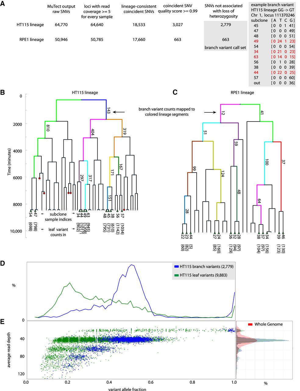 HT115 and RPE1 lineage sequencing experiments by the “optical tracking → lineage → called variants” approach. (A) Scheme of the analysis pipeline for identifying branch variant SNVs by the “optical tracking → lineage → called variants” approach. “Branch variants” are SNVs that occur at the same locus in two or more (but not all) subclones and are consistent with prior lineage information. Variant counts at different stages of the informatics filtering steps used to identify high-quality lineage structure concordant branch variants are shown for the HT115 and RPE1 lineage sequencing experiments. Detail on an example HT115 GG → GT branch variant is shown. Allele counts from sequence reads at Chromosome 1 diploid locus 111370246 are shown. Four subclone sequence libraries (subclone indices 49, 34, 63, and 44, marked in red) show about half the reads indicating a variant T allele, where all the other subclones support only the reference G alleles at this locus. This G → T SNV is scored as one of 404 branch variants that appeared within the two cell cycles represented by the pink segment on the right-hand side of the dendrogram representing the HT115 lineage experiment in B. (B,C) Dendrograms representing the HT115 and RPE1 lineage experiments; red circles mark time points where cells died during the lineage development and were not available for recovery from the device. The green triangles in the bottom of the dendrogram represent cells that were recovered, subcloned, and sequenced. Dendrograms are annotated with the count of “branch variants” for resolved lineage segments (some segments are resolved to individual cell cycles). Every sequenced subclone is annotated with its index number and the count of “leaf variants” for each sequenced subclone (at bottom). “Leaf variants” are SNVs that are supported by only one subclone and likely represent variants that arose during or after the last generation of the lineage experiment. The x-axis of the dendrogram only relates to linkage of the subclones. The y-axis of the dendrogram represents the culture time course, with each cell division event observed by time-lapse imaging marked by a branch point in the dendrogram. Single cells were recovered for subculture from the HT115 lineage after 141 h, while cells were recovered from the RPE1 lineage after 168 h. (D) HT115 branch variants are clonal. Histogram of allele fraction for detected variants. Comparison between branch variants (mutations occurring during lineage formation up to the last cell division) and leaf variants (mutations occurring within or subsequent to the last cell division event in the lineage). Branch variant SNVs show a bimodal allele fraction distribution peaked at 0.5 and 1.0 as expected for the measured ploidy (copy number variation [CNV] analysis) at variant loci in this mostly diploid cell line. In contrast, subclonal mutations appear in the leaf variant group and show an allele fraction distribution peaked well below 0.5 as the variant caller attempts to balance sensitivity for low allele fraction variants with false-positive detections without the enhanced performance available for branch variants. (E) Left panel: scatter plot of variants; average read depth versus allele fraction; branch variants (blue) and leaf variants (green). The branch variant read depth is tightly correlated with the variant allele fraction in accordance with clonal mutations. The leaf variants include many subclonal variants that blend with technical noise at low variant allele fractions. Right panel: normalized histogram of read coverage depth for HT115 lineage; whole-genome (red), called branch and leaf variants (blue and green).