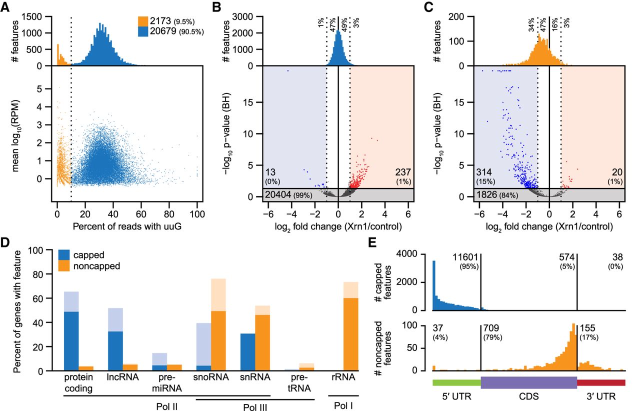 Identification of capped and noncapped 5′ end features with EndGraph. (A) RNA 5′ end features identified from 5 ng of floral bud total RNA, distributed by the proportion of nanoPARE reads containing an upstream untemplated guanosine (uuG). The vertical line separates putative noncapped features (low-uuG, orange) from putative capped features (high-uuG, blue). (B) Volcano plot of the change in read abundance for putative capped features after digestion with Xrn1 exonuclease. Bar plots depict the distribution of all capped features by fold change versus control. Dotted lines delimit a twofold change in feature abundance. Log2 fold change and Benjamini-Hochberg adjusted P-values (BH) were calculated by DESeq2. Horizontal line demarcates an adjusted P-value of 0.05. (C) Volcano plot as in B for putative noncapped features. (D) Capped and noncapped features overlapping TAIR10 genes classified by gene type. Lighter bars include features up to 500 nt upstream of the annotation. (E) Positional distribution of capped (top) and noncapped (bottom) features that overlap protein-coding genes.