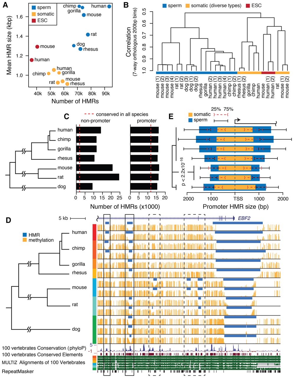 Mammalian sperm methylome characteristics. (A) The number and average size of HMRs in native assemblies. (B) Hierarchical clustering of aligned seven-way orthologous methylomes of multiple species and cell types. (C) The number of promoter HMRs and nonpromoter HMRs in seven-way orthologous sperm methylomes. Dashed lines indicate the average number of conserved HMRs across species. (D) Sperm DNA methylation of seven species in an example orthologous region. Methylome alignment is shown along with conservation tracks from MULTIZ alignment of 100 vertebrates and human repeat elements by RepeatMasker (Smit et al. 2013–2015). Regions in solid boxes show divergent methylation states at well-conserved elements. See zoomed-in browser image for dashed boxes in Supplemental Figure S2A. (E) The median size of hypomethylated regions upstream of and downstream from TSS in somatic (orange) and sperm (blue) methylomes of different species. HMR sizes are measured in their respective native genomes. Whiskers mark the 25th and 75th percentiles of HMR sizes upstream of or downstream from TSS. Wilcoxon rank-sum tests for all pairs of species between rodent species and nonrodent species showed significantly narrower HMRs in rodents.